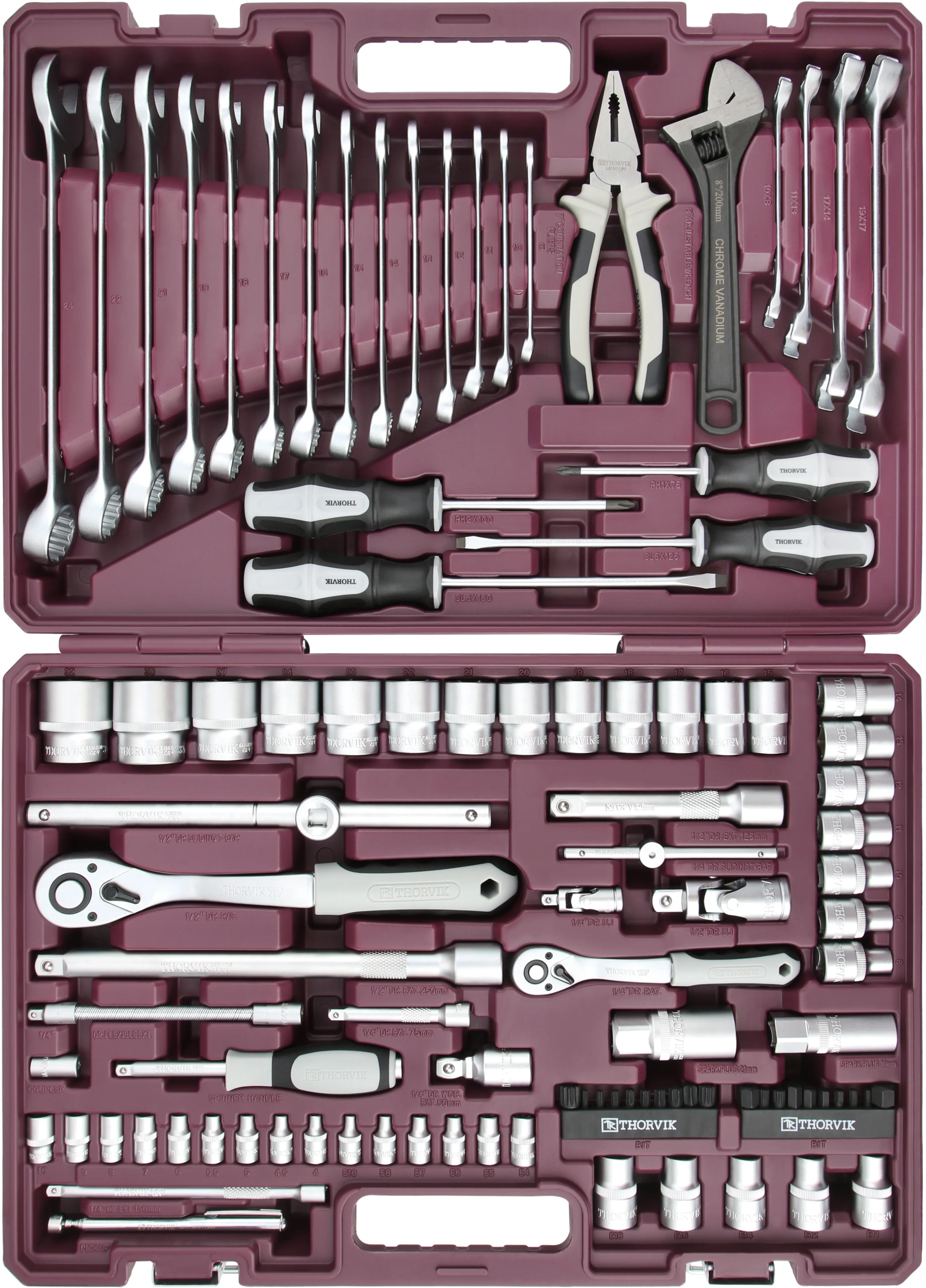 Описание Инструментальные наборы Thorvik - это высокое качество изделий, входящих в состав наборов, удобные прочные кейсы для хранения, оптимальная комплектация позволяющая удовлетворить потребность мастера при обслуживании техники и обеспечить всем необходимым рабочее место при производстве комплексных слесарно-монтажных или механосборочных работ. Наборы Thorvik имеют ударопрочный морозоустойчивый кейс с надежными металлическими замками, фосфатированное покрытие вставок бит обеспечит дополнительную стойкость к коррозии. Область применения Инструменты, представленные в наборе применяются при проведении работ связанных с обслуживанием изделий точной механики, электроники и бытовой техники, где рабочая зона ограничена и отсутствуют серьезные нагрузки. При производстве работ по обслуживанию автомобильной техники, благодаря небольшим размерам, набор незаменим для арматурных работ, ремонта и установки малых агрегатов и навесного оборудования двигателей.