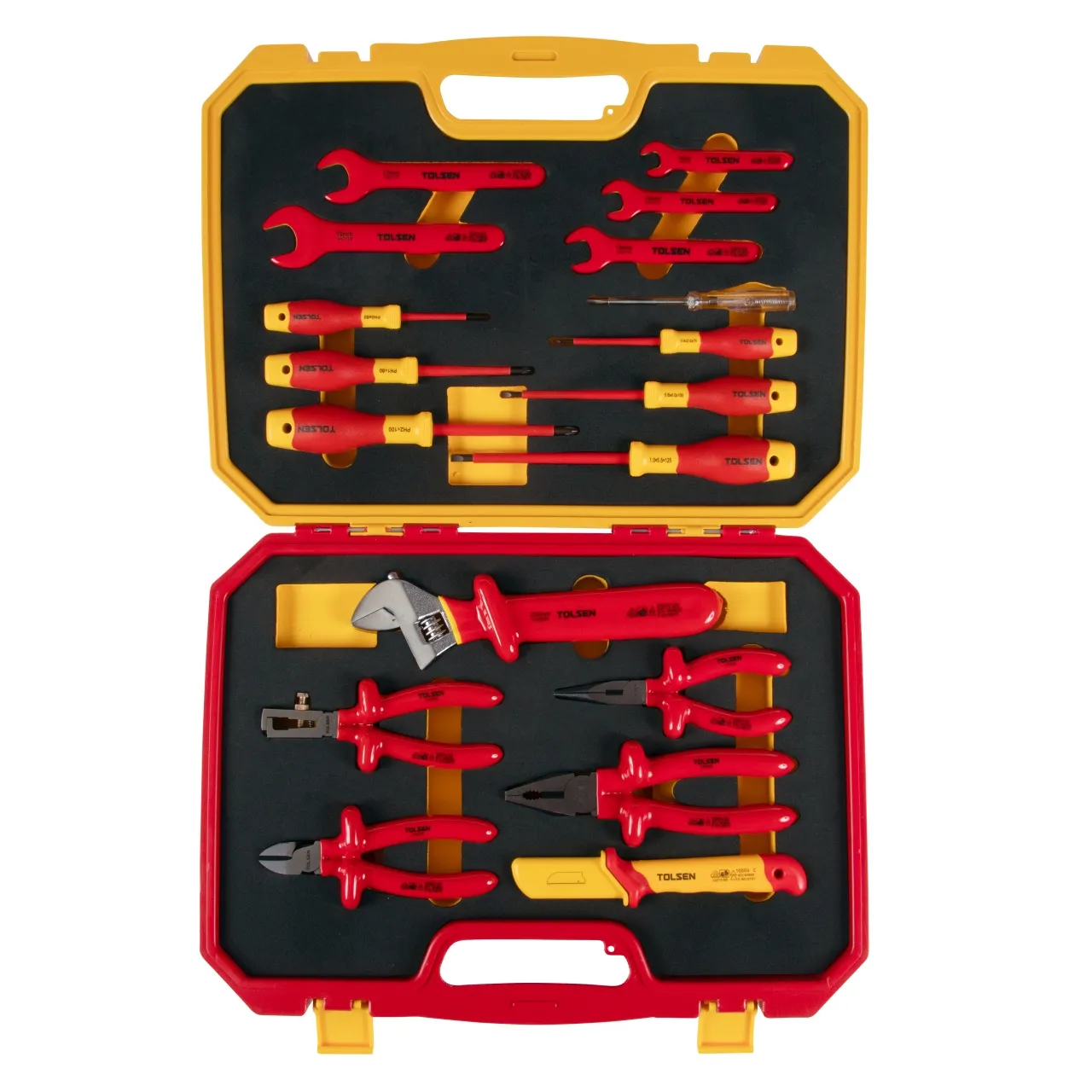 Материалы – сталь Cr-V, обливной PP (изоляция ключей, шарнирно-губцевого инструмента), PP+TPR (рукояти отвёрток, ножа), EVA (ложемент)