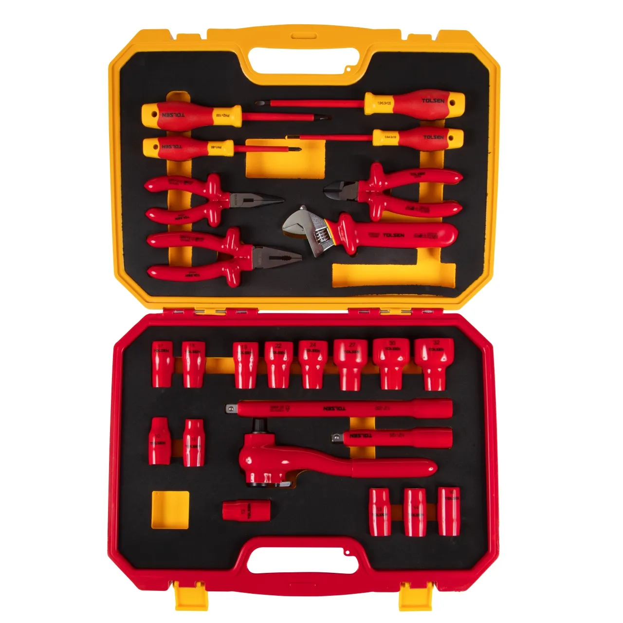 Материалы – сталь Cr-V, обливной PP (изоляция головок, принадлежностей, ключа, шарнирно-губцевого инструмента), PP+TPR (рукояти отвёрток), EVA (ложемент)