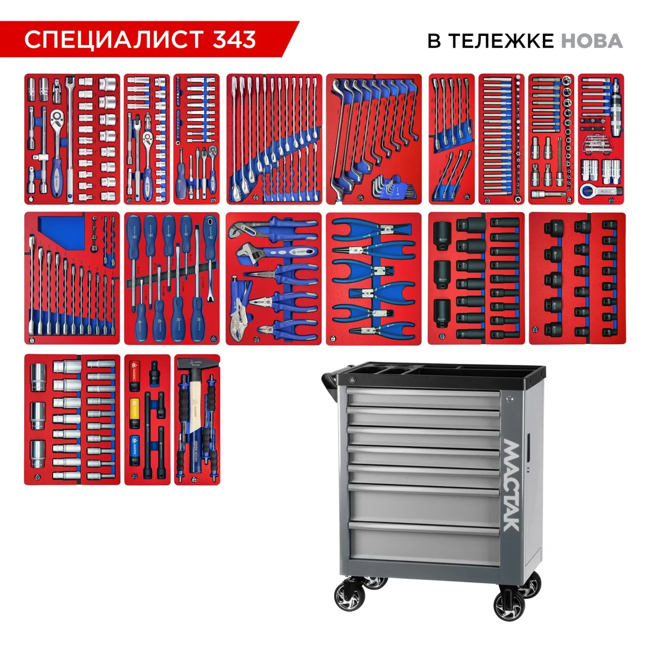 Набор инструментов 343 предмета, "СПЕЦИАЛИСТ 343", в тележке, МАСТАК 50-07343.