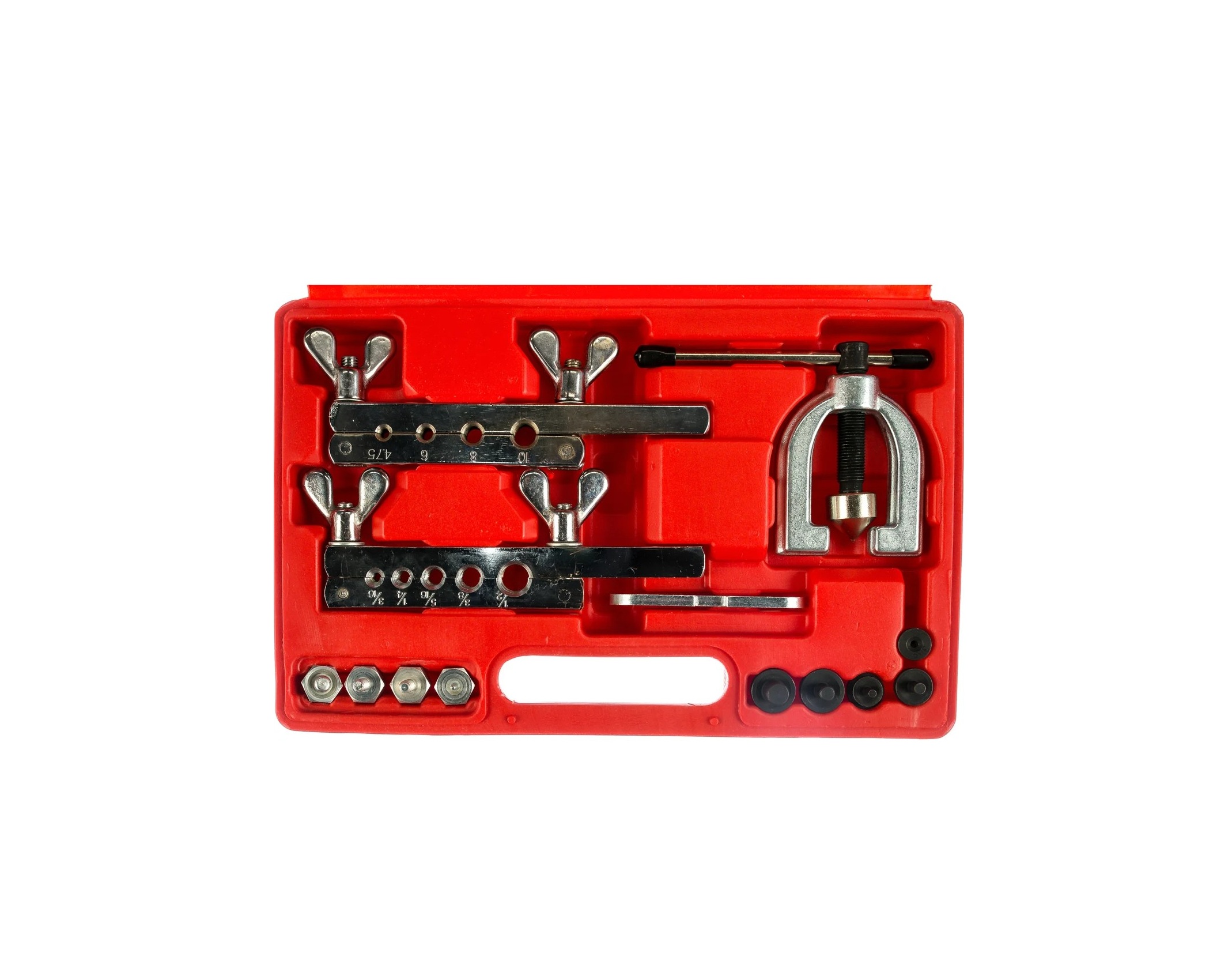 Инструмент для развальцовки труб ТА-М1080 — это набор из 13 предметов для изгибания трубок из меди и латуни различных систем:газовых, водопроводных, охлаждения и т.д.