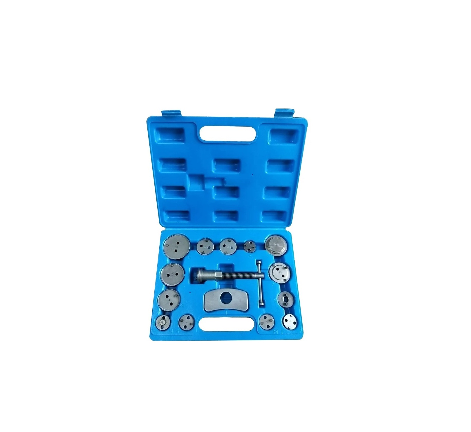 В пластиковом кейсе:1 правый болт и 14 адаптеров, которые подходят к размерам тормозных поршней большинства легковых машин.