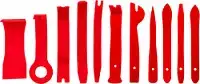 Набор приспособлений для демонтажа декоративных панелей салона автомобиля из 11 предметов. Инструменты, входящие в состав набора, применяются для демонтажа внутренних декоративных панелей салона автомобиля. Особая форма съемников предназначена для снятия панелей без повреждений. Специальный материал.
