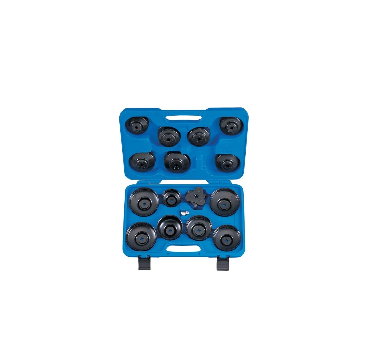 14 торцевых съёмников масляных фильтров – "чашки" от 66 до 108 мм 1 съёмник трёхлапый от 65 до 120 мм 1 переходник с 1/2" на 3/8" для подсоединения воротка или трещотки