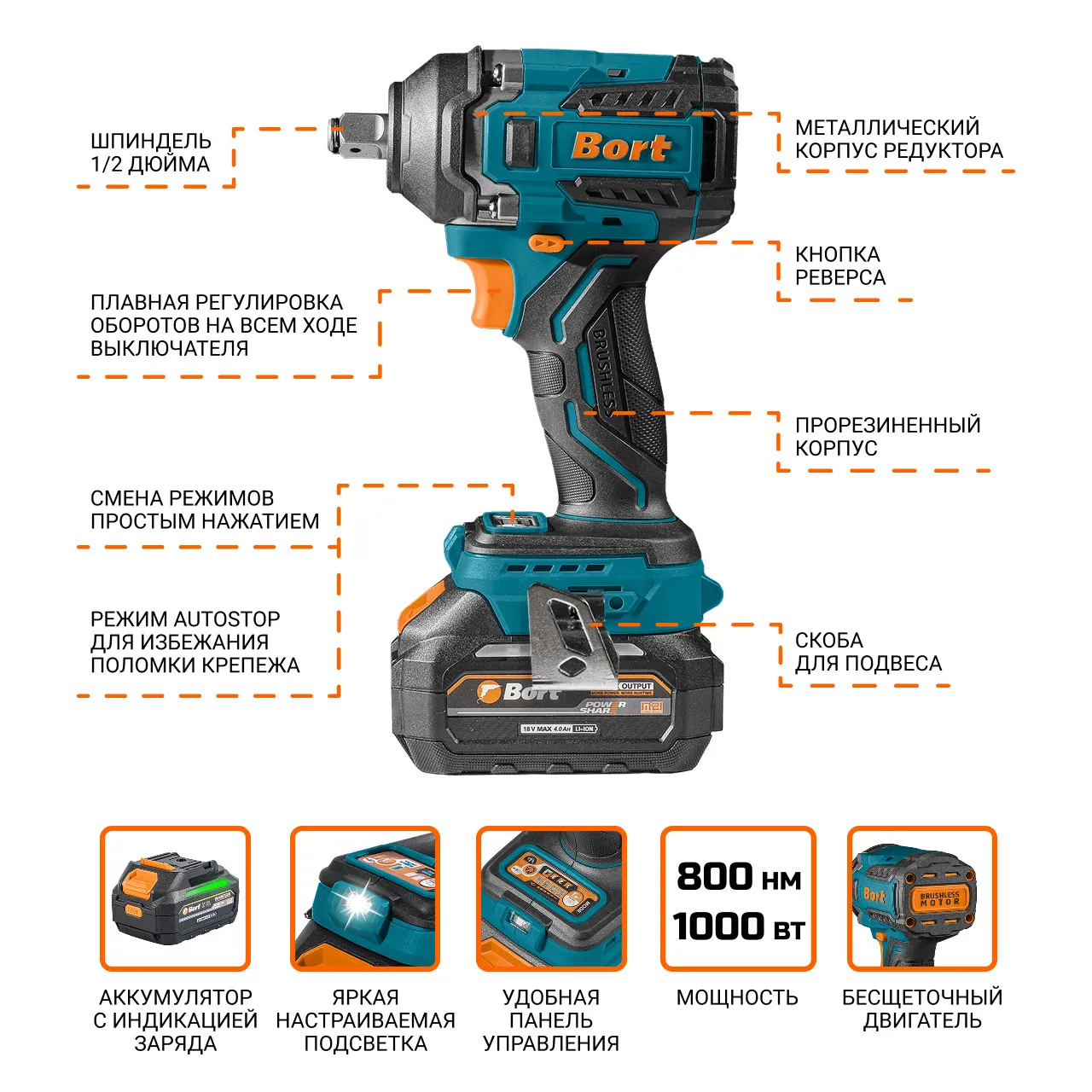 | Совместимость с аккумуляторами | Bort 18В (Makita 18V LXT) |