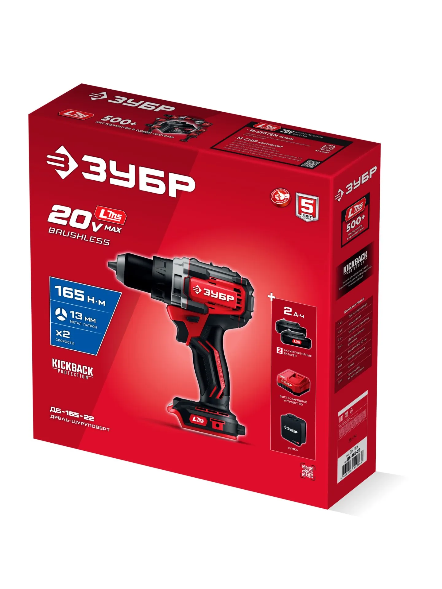 Бесщеточная дрель-шуруповерт ЗУБР системы LMS с максимальным крутящим моментом 165 Нм предназначена для работы с самым крупным крепежом (саморезы до 12 мм диаметром) и сверления отверстий до 40 мм в дереве. Встроенная защита от обратного удара предотвращает повреждение кисти при резкой блокировке вала. Комплектация с двумя аккумуляторами позволяет работать практически без остановки