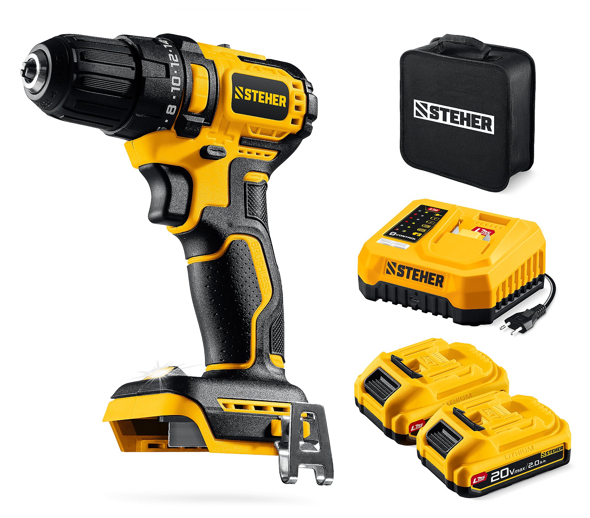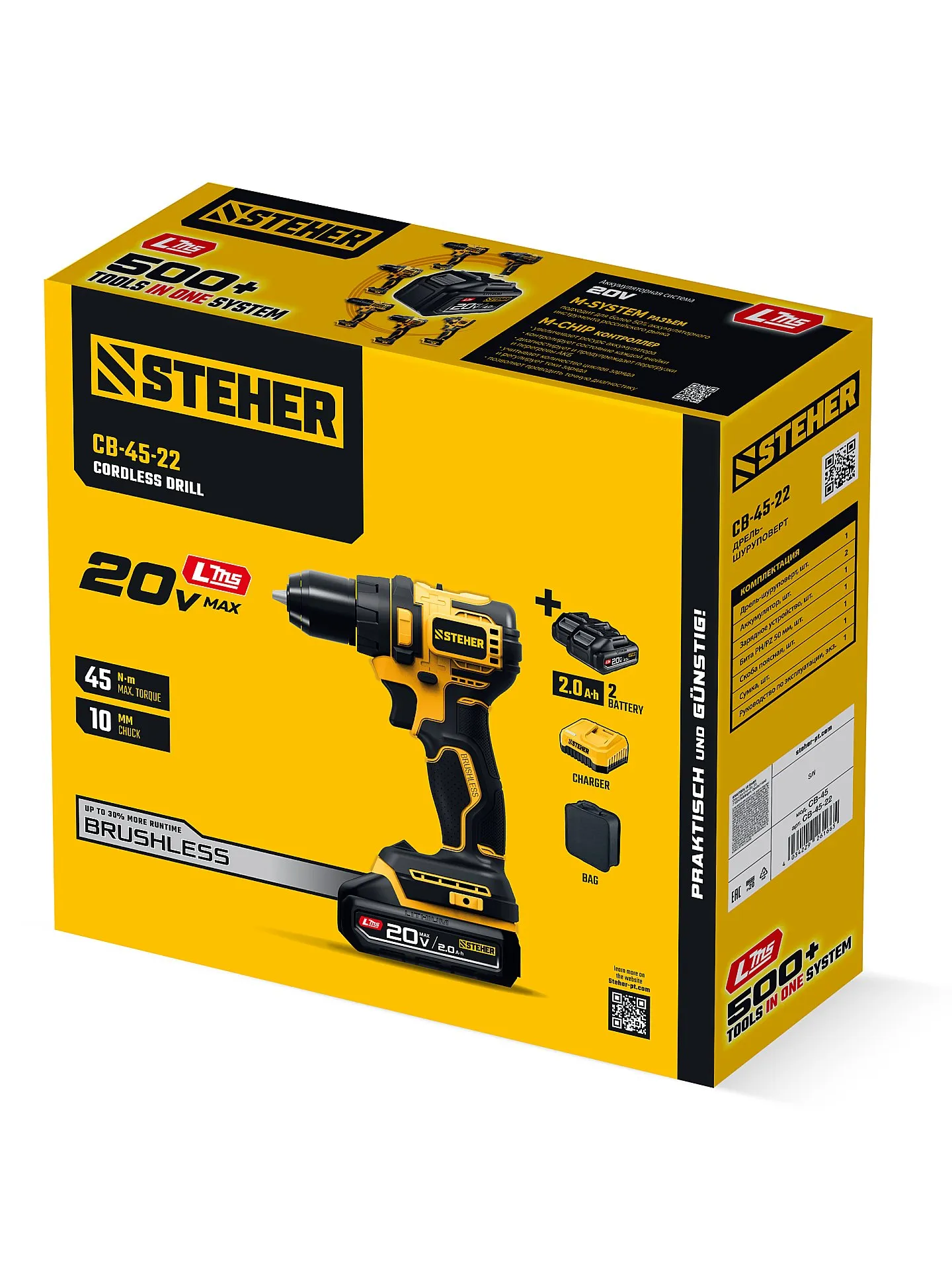 Бесщеточная дрель-шуруповерт STEHER обеспечивает как точное заворачивание маленьких саморезов, так и уверенное закручивание крупного крепежа до 8мм. Компактный размер и современный дизайн делают ее удобной для работы. Комплектация с двумя аккумуляторами позволяет работать практически без остановки