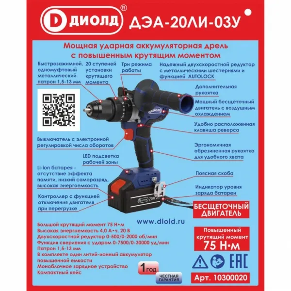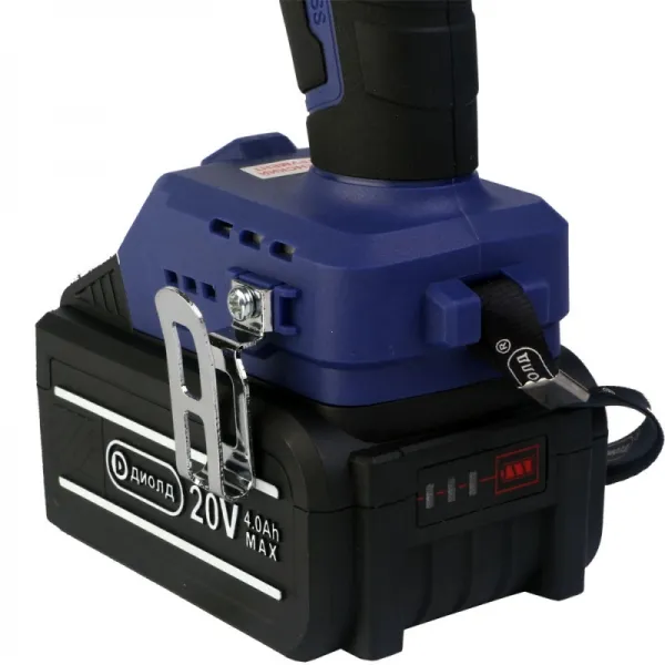 Дрель-шуруповерт аккумуляторная Диолд ДЭА-20ЛИ-03 У представляет собой современную модель с аккумулятором 20 В и ёмкостью 4 Ач, со встроенной подсветкой рабочей зоны для удобства эксплуатации на затемненном участке.Бесщеточный шуруповерт оснащен вентильным двигателем постоянного тока. Функции коллекторно-щеточного узла выполняются электронным блоком управления. Хорошая переносимость кратковременных перегрузок по крутящему моменту. Экономный расход энергии. КПД бесщеточных двигателей около 90 %. Отсутствие электрического искрения и, как следствие, безопасность работы во взрывоопасных смесях газов.Простота регулировки частоты вращения и возможность изменения ее в широких пределах.Реверс делает возможным выкручивание саморезов и упрощает выведение застрявшего в материале сверла.Отличная вентиляция отводит излишнее тепло от двигателя, что продлевает срок службы аккумуляторного шуруповерта.В комплект поставки входят два литий-ионных аккумуляторных блока с защитной электроникой для работы без перерывов.Двухступенчатый редуктор с металлическими шестернями и функцией AUTOLOCK.Режим ударного сверления делает данный инструмент более универсальным.На шуруповерте имеется 20 положений установки крутящего момента.Металлический одномуфтовый быстрозажимной патрон 13 мм.Контроллер с функцией отключения двигателя при перегрузке.Выходной вал сделан из высокотехнологичного литья. Точная кнопка переключения скоростей. Индикатор уровня остаточного заряда. Два крепления: наручное и поясное.Моноблочное зарядное устройство. Индикатор уровня заряда батареи.Встроенная LED-подсветка. Повышенный крутящий момент. Три режима работы.
