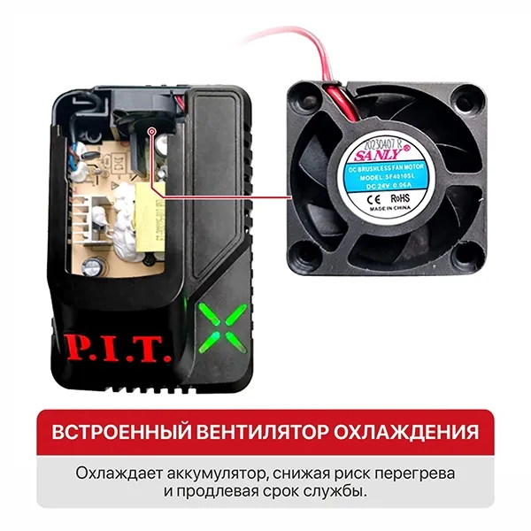 Зарядное устройство PH20-4.0A предназначено для зарядки любых аккумуляторов P.I.T. системы OnePower20V. Светодиодная индикация позволяет контролировать процесс зарядки и состояние аккумулятора. Пятиконтактный порт зарядки обеспечивает бережную и равномерную зарядку каждой ячейки аккумулятора без перегрева и перезарядки. Корпус изготовлен из огнестойкого материала, который является безопасным и долговечным. Встроенный вентилятор охлаждает аккумулятор, снижая риск перегрева и продлевая срок службы.