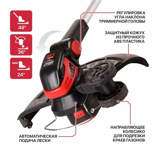 Автоматическая подача лески, телескопическая штанга и регулировка углов наклона триммерной головы и дополнительной рукоятки позволяют настроить инструмент максимально удобно.