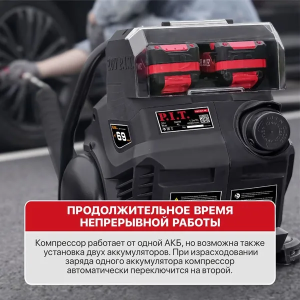 Компрессор работает от одной АКБ, но в конструкции реализована возможность установки двух аккумуляторов. При израсходовании заряда одного аккумулятора компрессор автоматически переключится на второй. Это обеспечивает более продолжительное время непрерывной работы.