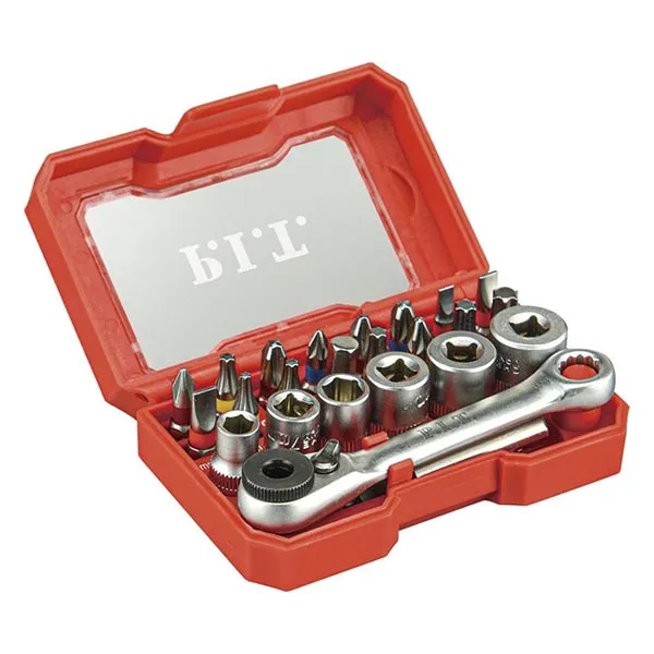 Набор бит в кейсе, биты закреплены в гнездах, шестигранный хвостовик 1/4" по стандарту БО 1173, промышленного качества, с цветными идентифицирующими кольцами для различения типов головок винтов; торцевые головки изхром-ванадиевой стали(Сг\/) наиболее распространенных размеров, ключ-трещётка из нержавеющей стали с шестигранником 1/4".