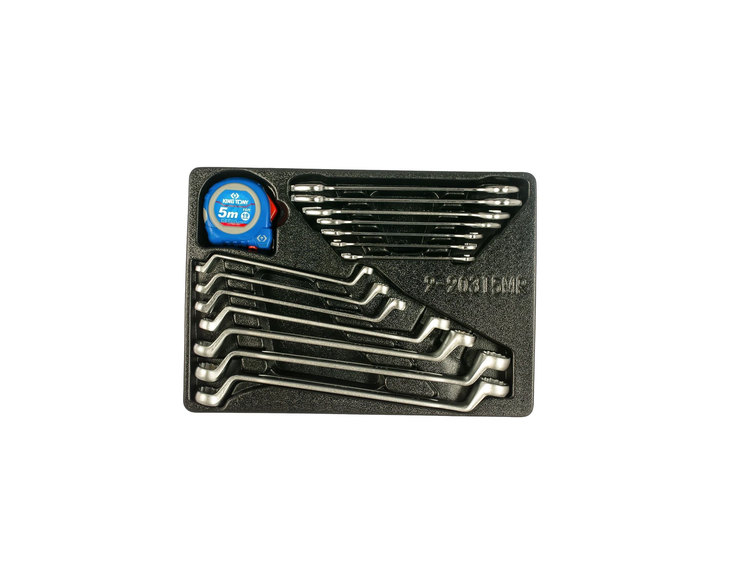Набор торговой марки King Tony включает в себя ключи накидные, ключи рожковые и рулетку, предназначен для монтажа и демонтажа крепёжных узлов различных изделий, устройств и агрегатов. Материал ложемента – ПВХ (поливинилхлорид). Изготовлен специально для комплектации инструментальной тележки.