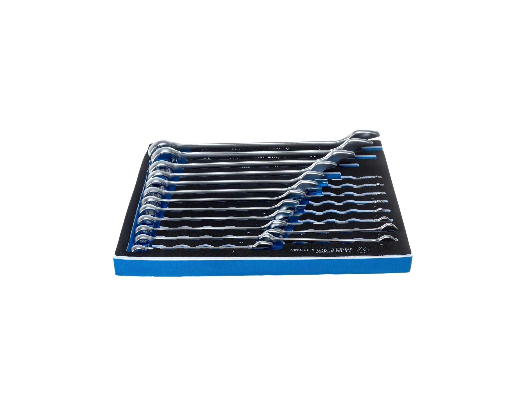 Комплектация включает комбинированные ключи 1060 следующих размеров: 6, 7, 8, 9, 10, 11, 12, 13, 14, 15, 16, 17, 18, 19, 21, 22, 24, 27, 30, 32 мм. Материал ложемента – EVA (этиленвинилацетат), лёгкий, прочный, эластичный и упругий, устойчивый к маслам и растворителям, при деформации возвращает прежнюю форму. Ложемент адаптирован для размещения на полке инструментальной тележки.