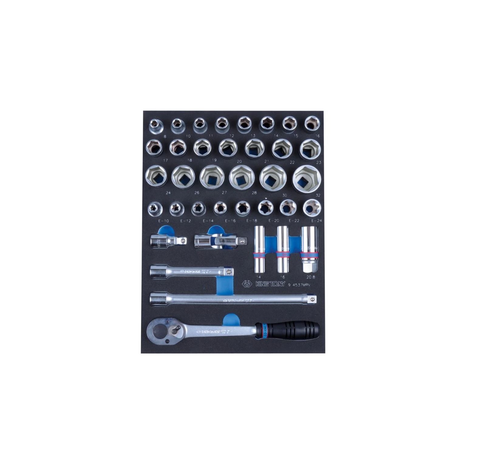 Особенности: размер ложемента адаптирован для размещения на полке инструментальной тележки. Материал ложемента – EVA – лёгкий, прочный, эластичный и упругий, обладающий хорошими амортизирующими свойствами, устойчивый к маслам и растворителям, при деформации возвращает прежнюю форму. EVA (ЭВА, полимер на основе этилена и винилацетата) – материал, не имеющий равных по своим характеристикам и удовлетворяющий условиям интенсивной эксплуатации в условиях ежедневной работы.
