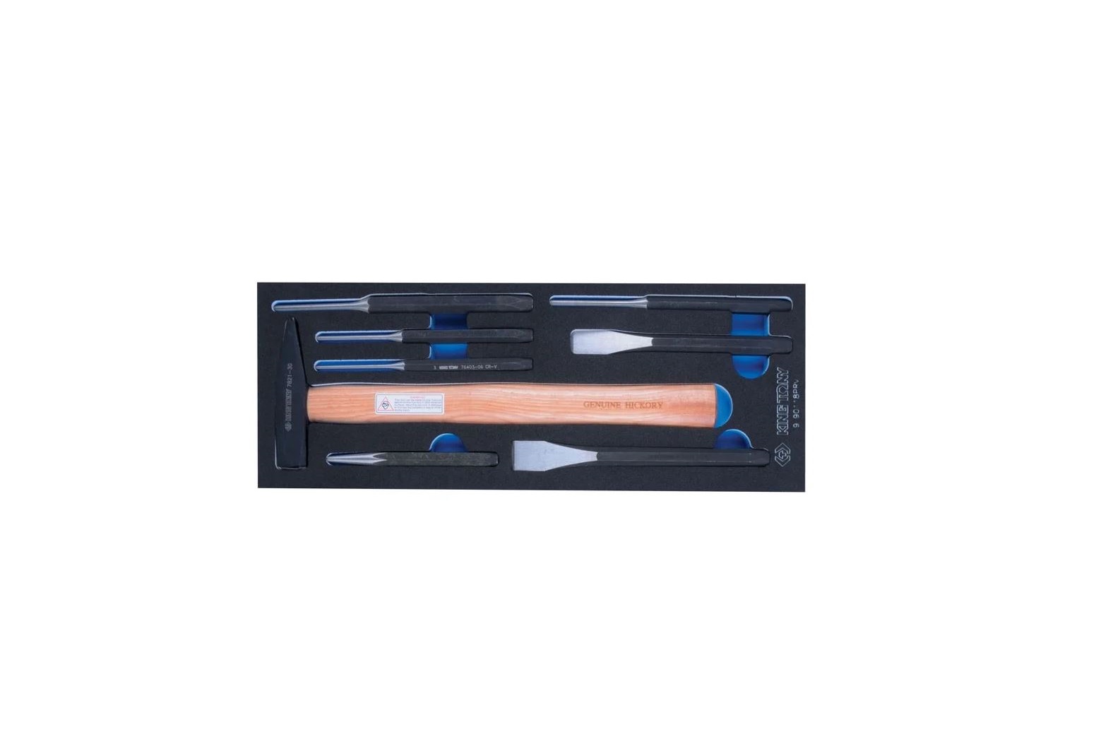 Особенности: инструменты изготовлены из закалённого хром-ванадиевого сплава. Термически обработанные ударные рабочие поверхности предохраняют от сколов и замятий. Размер ложемента адаптирован для размещения на полке инструментальной тележки. Материал ложемента – EVA – лёгкий, прочный, эластичный и упругий, обладающий хорошими амортизирующими свойствами, устойчивый к маслам и растворителям, при деформации возвращает прежнюю форму. EVA (ЭВА, полимер на основе этилена и винилацетата) – материал, не имеющий равных по своим характеристикам и удовлетворяющий условиям интенсивной эксплуатации в условиях ежедневной работы.