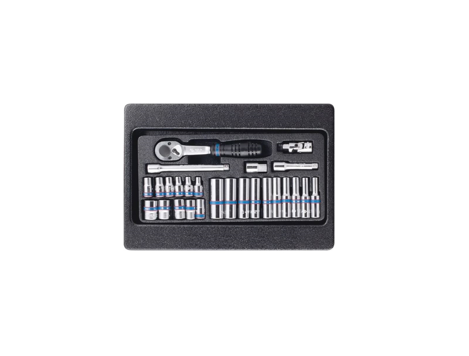 Набор с инструментом торговой марки KING TONY включает в себя торцевые головки и принадлежности, предназначен для монтажа и демонтажа крепёжных узлов различных изделий, устройств и агрегатов. Материал ложемента – ПВХ (поливинилхлорид). Изготовлен специально для комплектации инструментальной тележки.