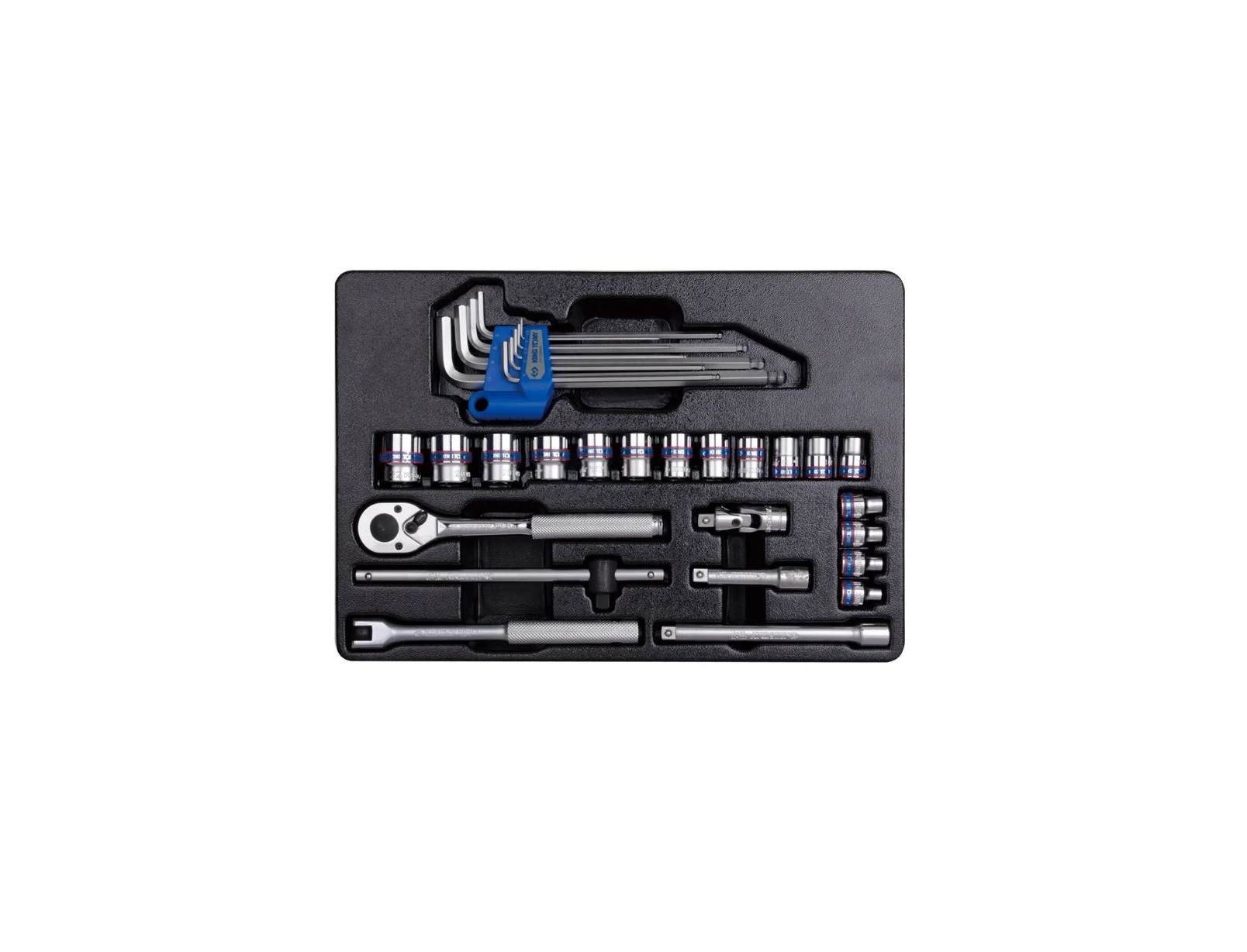 Набор с инструментом торговой марки KING TONY включает в себя торцевые головки и принадлежности, предназначен для монтажа и демонтажа крепёжных узлов различных изделий, устройств и агрегатов. Изготовлен специально для комплектации инструментальной тележки.