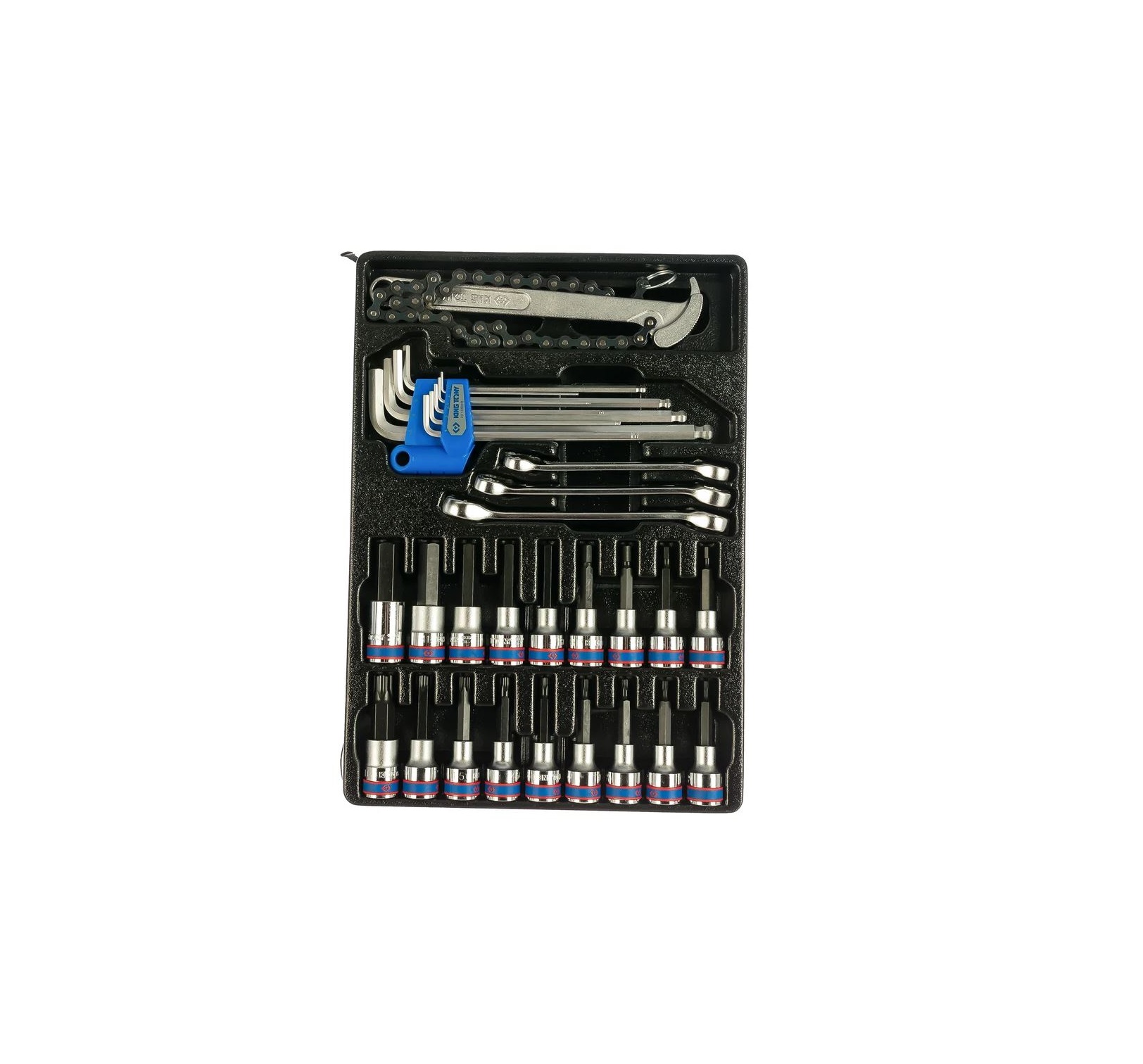 Набор включает в себя инструменты для работы с внутренним шестигранным профилем, а также профилем torx. входящие в состав разрезные ключи предназначены для работ с гайками, расположенными на трубках, длинных шпильках и т.п. специальный цепной съёмник предназначен для работ по монтажу и демонтажу масляных фильтров.