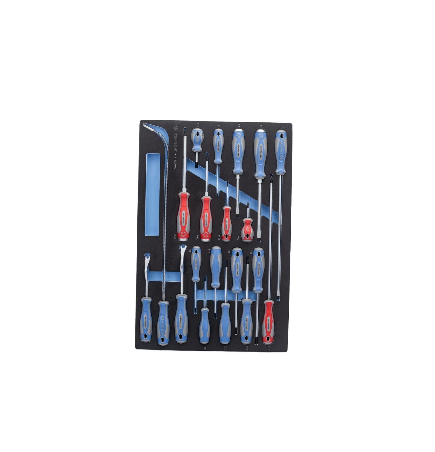 Материал ложемента – EVA (ЭВА, этиленвинилацетат). Легкий, прочный, эластичный и упругий материал с хорошими амортизирующими свойствами, устойчивый к маслам и растворителям, при деформации возвращает прежнюю форму. Изготовлен специально для комплектации инструментальной тележки.