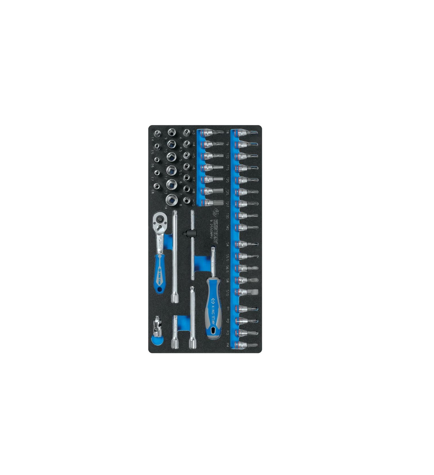Комплект включает головки торцевые стандартные 6-гранные 2335M (4–14 мм), головки торцевые e-стандарт (torx) 2375M (E4–E8), трещотку флажковую 2771-55G 140 мм (24 зубца), вороток скользящий 2571-45 115 мм, вороток-отвертку 2178DF 150 мм, кардан 2792 36 мм, удлинители с шаровым окончанием 15° 2293 (100, 150 мм) и удлинитель 2221-02 50 мм.