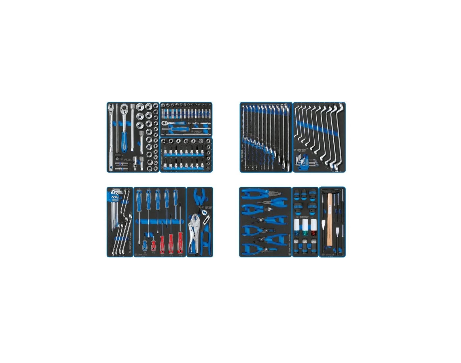 Набор включает торцевые головки 1/2" и 1/4", торцевые насадки 1/2"&3/8" TORX и HEX, комбинированные и накидные ключи, разрезные ключи, шестигранники Г-образные, отвертки, пассатижи, переставные клещи, зажимы, съемники стопорных колец, ударные головки 1/2", зубила, выколотки и кернеры с молотком.