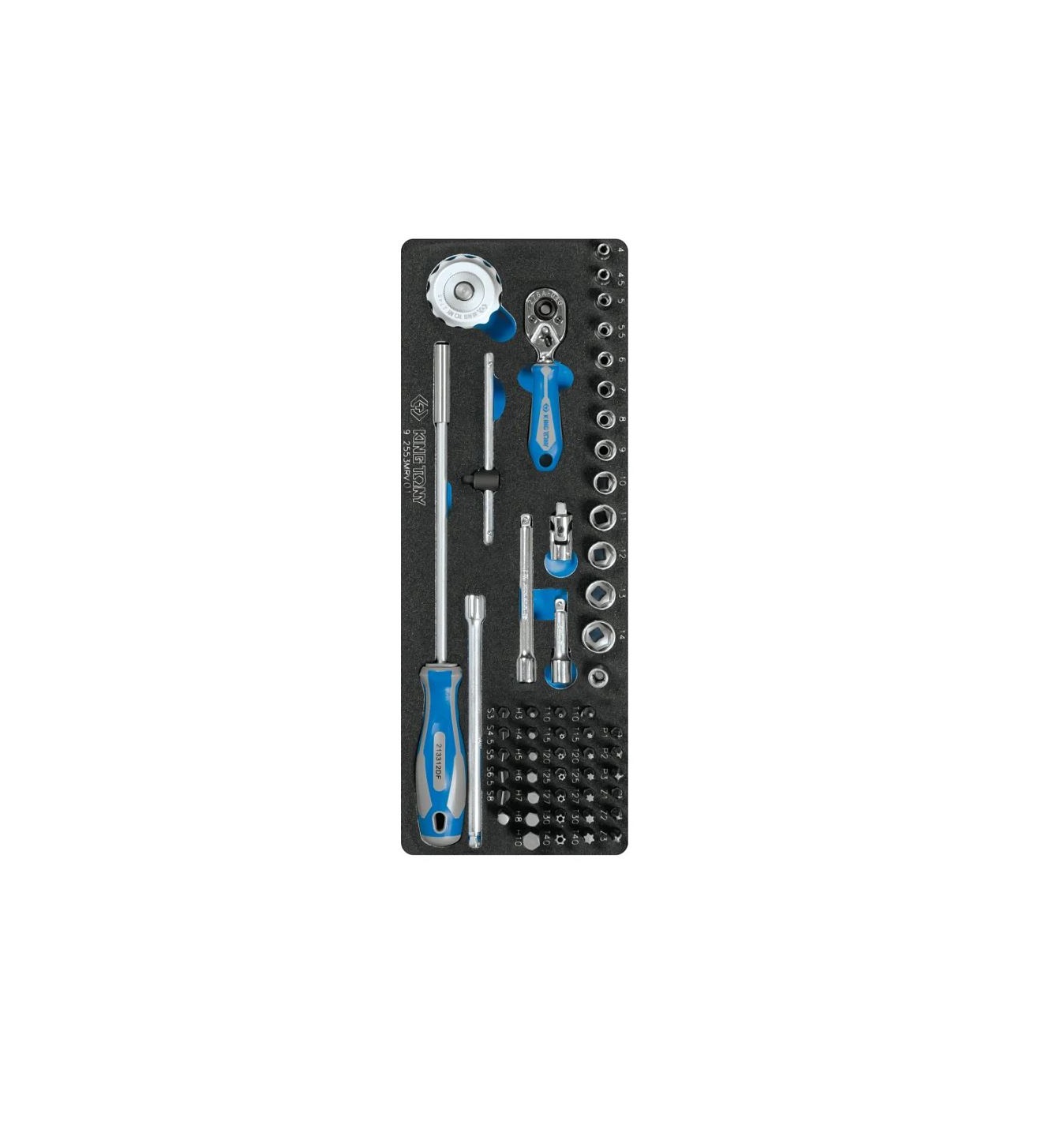Набор включает головки короткие 6-гранные (4–14 мм), трещотки флажковую и бесшаговую для вставок (бит), отвертку-вороток для вставок, переходник-вставку для головок, вороток скользящий, удлинители, кардан и держатель вставок 1/4".