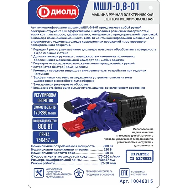 Машина ручная электрическая ленточношлифовальная МШЛ-0,8-01 предназначена для шлифования изделий из различных материалов в бытовых условиях.