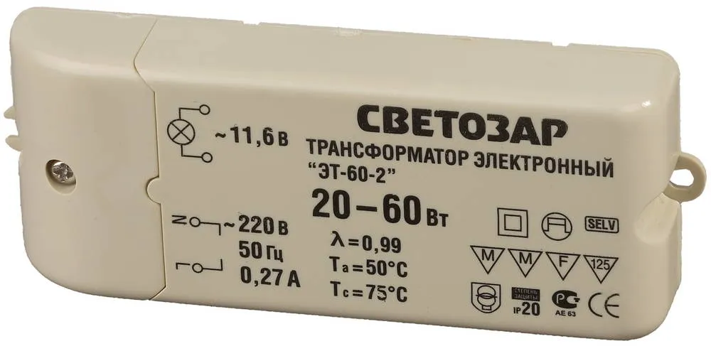 Электронный трансформатор для галогенных ламп СВЕТОЗАР предназначен для питания галогенных ламп напряжением 12 В. Входное напряжение: 220 В, 50 Гц.