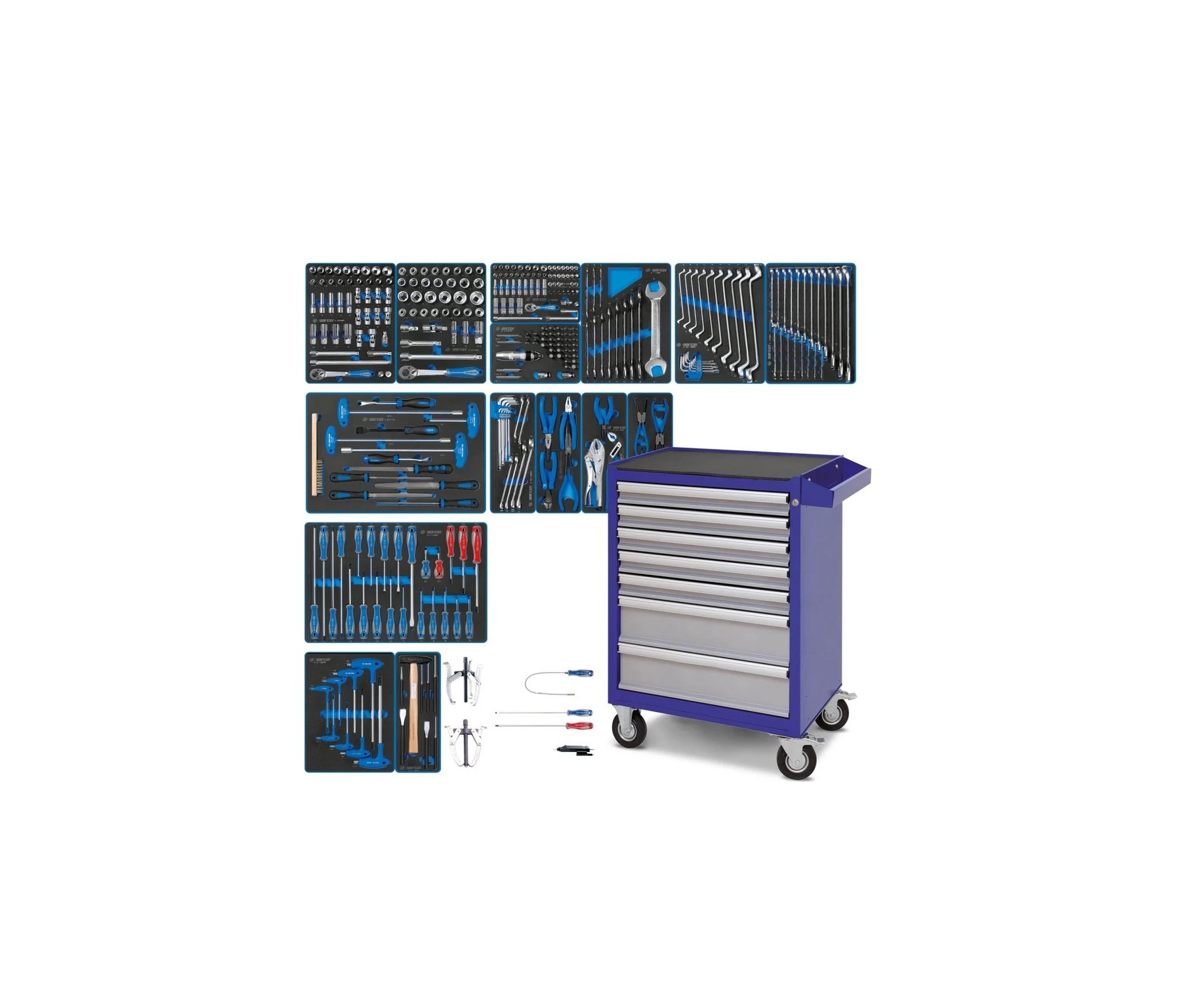 Стандартизация размерности ложементов позволяет разместить наборы на ваше усмотрение в любом варианте организации рабочего пространства – по типу, назначению или частоте использования. Вы всегда будете иметь под рукой тот инструмент или приспособление, которое вам необходимо в данную минуту, а ячейки ложементов позволят содержать набор в полном порядке.
