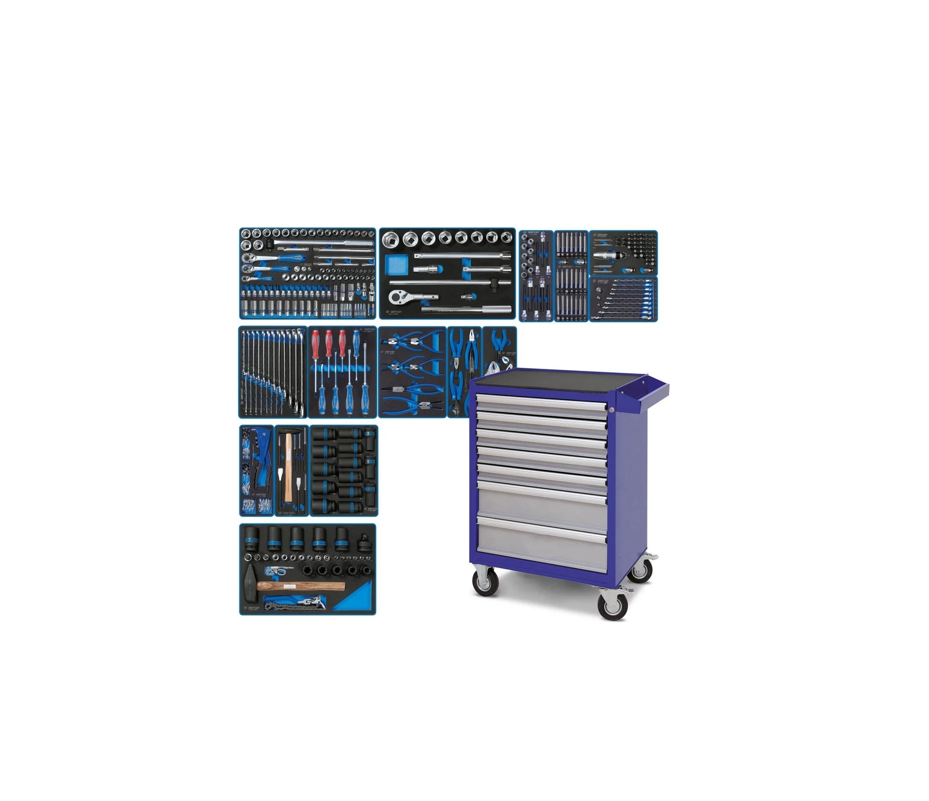 Стандартизация размерности ложементов позволяет разместить наборы на ваше усмотрение в любом варианте организации рабочего пространства – по типу, назначению или частоте использования. Вы всегда будете иметь под рукой тот инструмент или приспособление, которое вам необходимо в данную минуту, а ячейки ложементов позволят содержать набор в полном порядке.