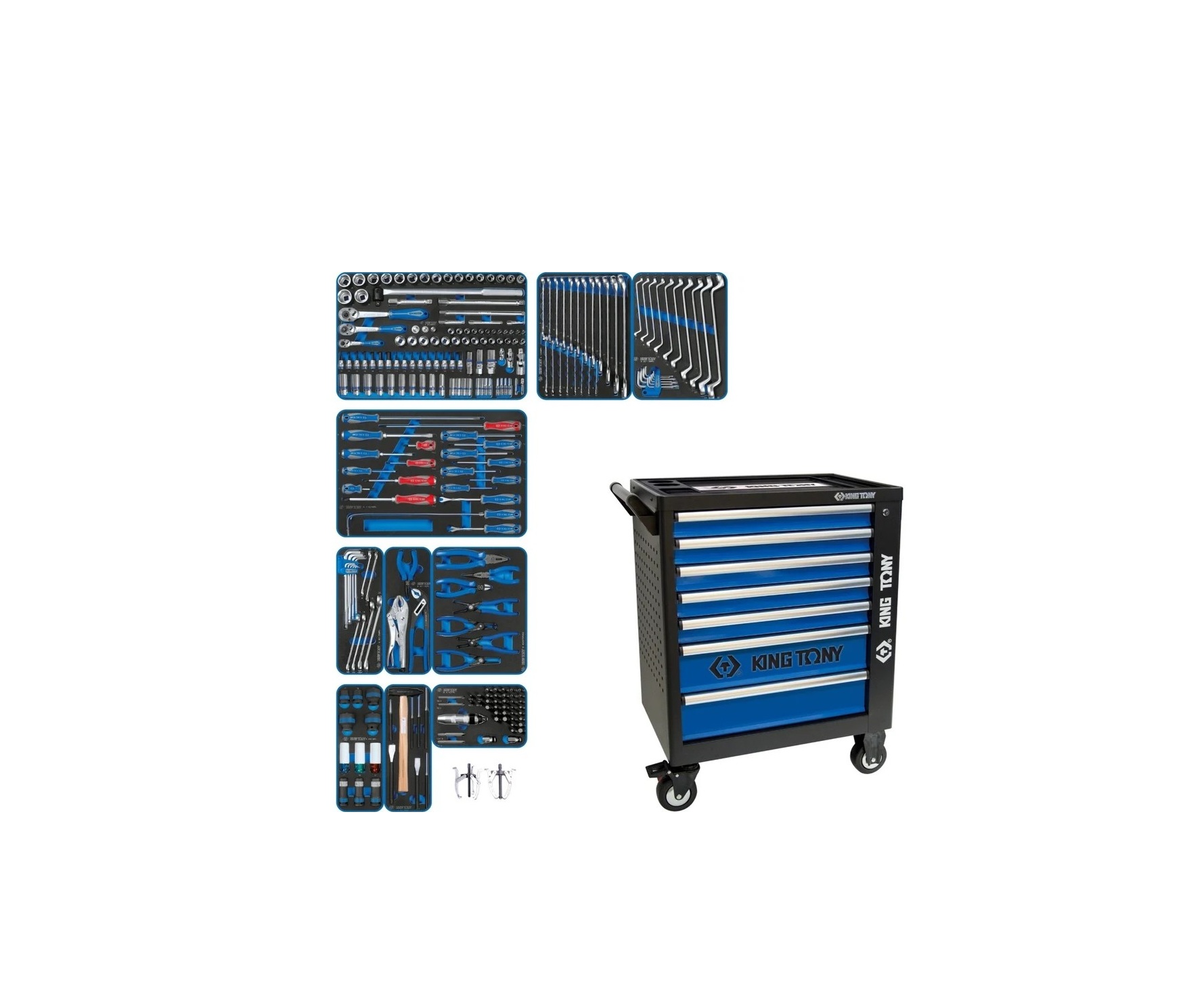 Наименование / тип инструмента Артикул Кол-во предметов Модуль 1 Набор торцевых головок 1/4", 3/8", 1/2" с принадлежностями 9-9503MRV01 103 Модуль 2 Набор комбинированных ключей 9-1220MRV 20 Набор накидных ключей и Torx L-образных 9-90119MRV 19 Модуль 3 Набор отверток, съемник клипс и гибкий магнит 9-31920MRV 20 Модуль 4 Набор разрезных ключей и шестигранники Г-образные 9-90135MRV 15 Набор пассатижи, переставные клещи и зажим 9-40113GPV 3 Набор съемников стопорных колец, пассатижей и бокорезов 9-40207GPV02 7 Модуль 5 Набор ударных головок 1/2" 9-4401MPV 11 Набор зубил, выколоток, кернеров с молотком 9-90118PRV 8 Набор вставок (бит) и ударная отвертка 9-4143FRV 43 Съемник подшипников 3-х захватный 100 мм 7963-04 1 Съемник подшипников 2-х захватный 100 мм 7962-04 1