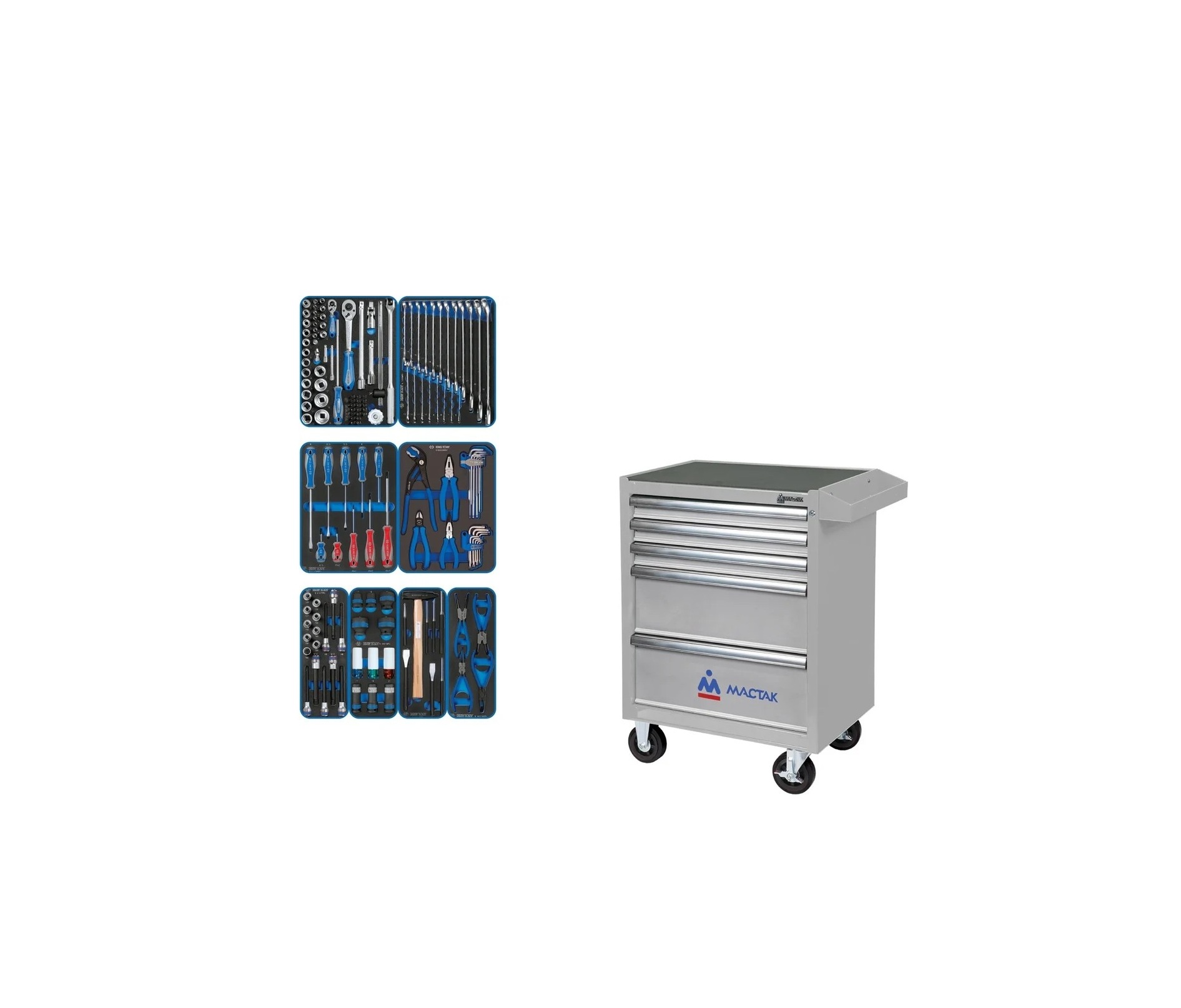 Наименование / тип инструмента Артикул Кол-во предметов Модуль 1 Набор торцевых головок 1/4"&1/2" с принадлежностями 9-7560MRV01 60 Набор комбинированных ключей 9-12D20MRV 20 Модуль 2 Набор отверток 9-31110MRV 10 Набор пассатижей, шестигранников и TORX Г-образных 9-90222MRV 22 Модуль 3 Набор насадок HEX, TORX и SPLINE 9-4147PRV 17 Набор ударных головок 1/2" 9-4401MPV 11 Набор зубил, выколоток, кернеров с молотком 9-90118PRV 8 Набор съемников стопорных колец 9-44214GPV 4