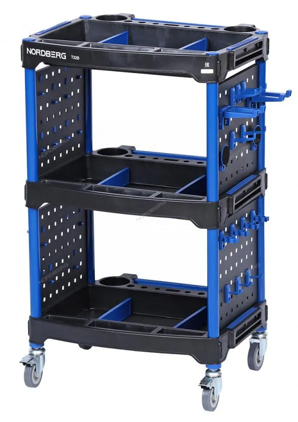 Тележка инструментальная NORDBERG 3 пластиковые полки, синяя T32B с полками – для удобства работы и хранения инструмента в автосервисах, СТО и частных гаражах.