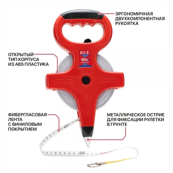 Геодезическая рулетка HTMF03-0050 или рулонная измерительная лента, является идеальным ручным инструментом для всех видов измерения длины и разметки внутри или снаружи помещений, во дворе, в поле, на строительных или спортивных площадках. Широкое полотно из стекловолокна с защитным виниловым покрытием от истирания легко сгибается и разгибается, не растягивается и устойчиво к воздействию окружающей среды при работе на местности. Простая выдвижная складная ручка, эргономичная анатомическая рукоятка, металлическое коническое остриё для фиксации в грунте, широкое и длинное полотно - всё для точного, простого и быстрого измерения длины или нанесения разметки.