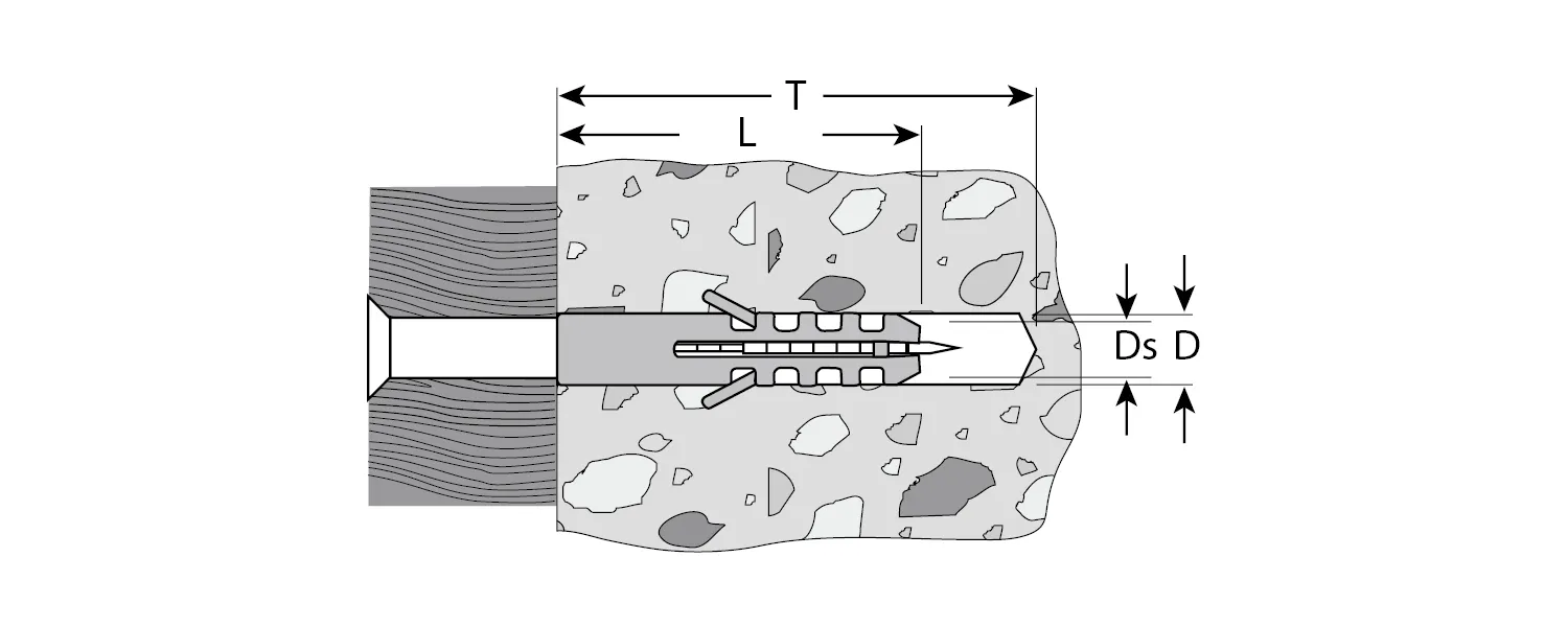 Для монтажа элементов и конструкций к полнотелым строительным материалам (бетон, кирпич, природный камень). Фиксация дюбеля происходит при вкручивании в него самореза (в комплект не входит). Диаметр предварительного сверления: 8 мм.