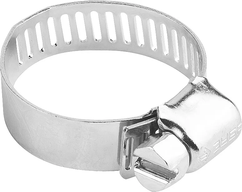 Стальной червячный хомут состоит из штампованной ленты и винта с червячной резьбой. По всей длине ленты имеются просечки, расположенные на одинаковом расстоянии друг от друга. При вращении винта лента сжимается, благодаря чему создается надежное и герметичное соединение шлангов, различных труб, и т.д. Червячный винт снабжен шестигранной головкой под ключ 8 мм и шлицем SL, что позволяет использовать при монтаже гаечный ключ или шлицевую отвертку.