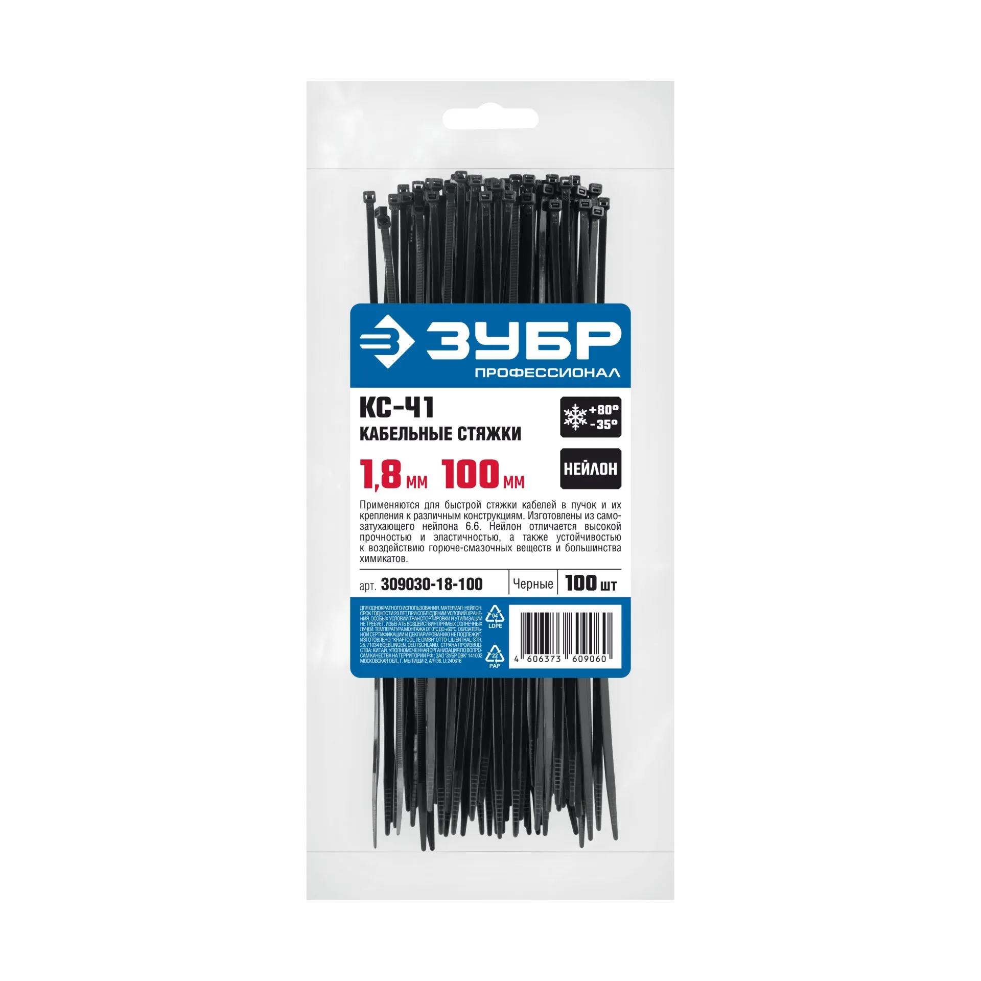 ЗУБР КС-Ч1, 1.8 x 100 мм, нейлон РА66, 100 шт, черные, кабельные стяжки, Профессионал (309030-18-100) наличный и безналичный расчет