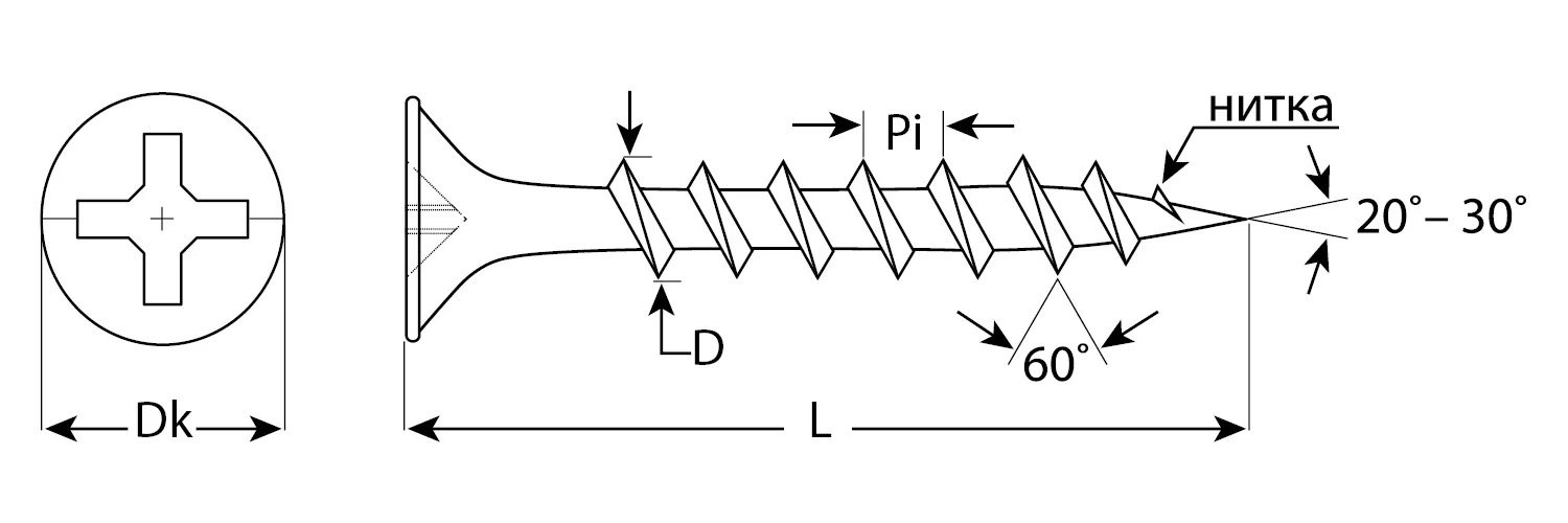 Саморезы для гипсокартона изготовлены из стального прутка с высоким содержанием углерода. Контроль за геометрией самореза начинается с калибровки прутка и заканчивается тщательной проверкой размеров готового изделия. Нормативная твердость стали достигается термической обработкой. Поверхностная твердость 450-720HV, твердость в сердцевине 290-450HV. Саморезы легко вкручиваются обычным шуруповертом или отверткой с крестообразным шлицем PH2 (DIN). Предварительное сверление в скрепляемых материалах не требуется.