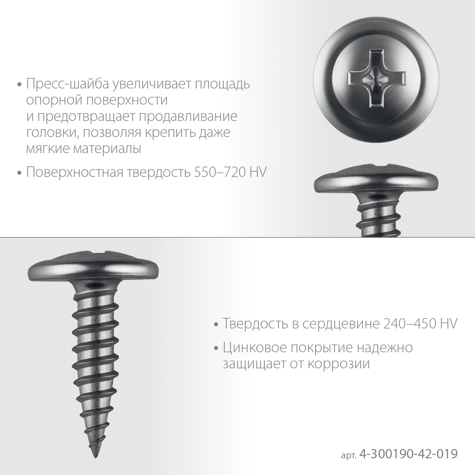 Саморезы с пресс-шайбой для листового металла изготовлены из стального прутка с высоким содержанием углерода. Контроль за геометрией самореза начинается с калибровки прутка и заканчивается тщательной проверкой размеров готового изделия. Нормативная твердость стали достигается термической обработкой. Поверхностная твердость 550-720HV, твердость в сердцевине 240-450HV. Саморезы легко вкручиваются обычным шуруповертом или отверткой с крестообразным шлицем PH2 (DIN). Предварительное сверление в скрепляемых материалах не требуется. Геометрические размеры: диаметр пресс-шайбы (W) - 10.5-11.0мм, диаметр головки (Dk) - 6.5-7.0мм, диаметр резьбы (D) - 4.1-4.3мм, шаг резьбы (Pi) - 3.38мм.