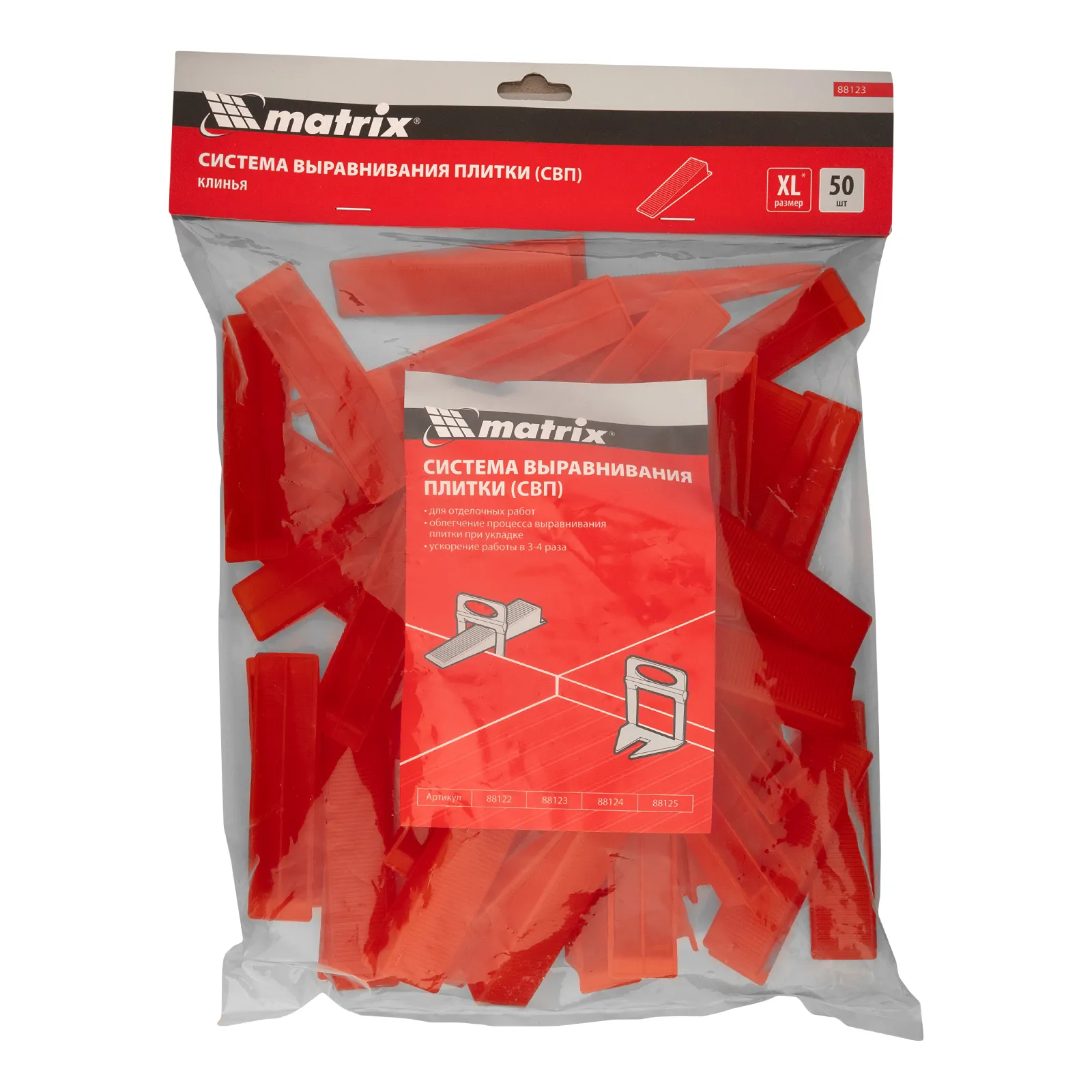 Система выравнивания плитки (СВП Ворота XL) Matrix 88123 включает в себя клинья (50 шт. в пакете), совместно с зажимами Matrix 88122 облегчающие укладку керамической или керамогранитной плитки толщиной 4-13 мм на стены или на пол. Клинья пригодятся не только начинающим мастерам, но и профессионалам. Благодаря СВП плитка не смещается и не проседает в процессе высыхания, швы получаются ровными и аккуратными, что гарантирует качественный результат.