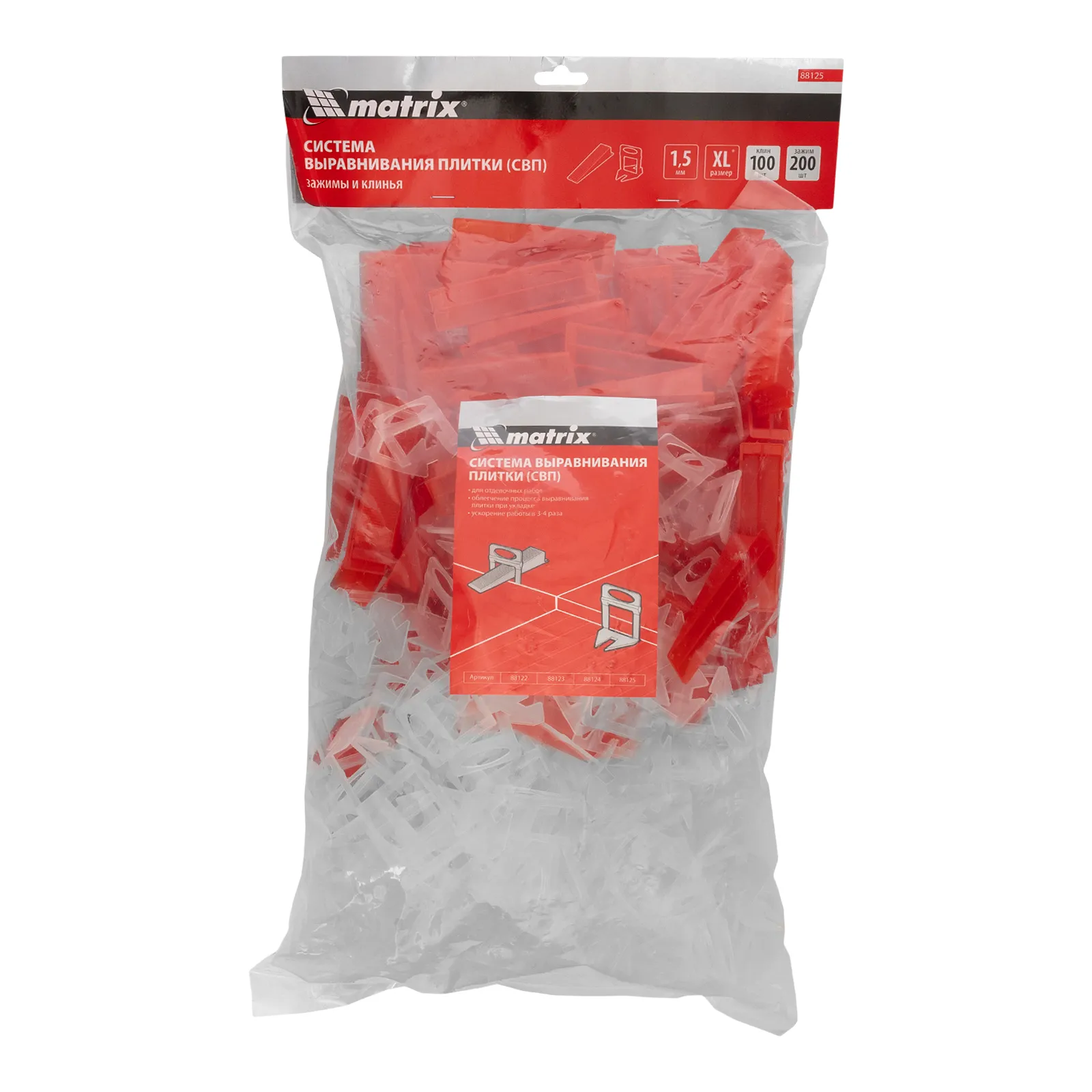 Система выравнивания плитки (СВП Ворота) Matrix 88125 включает все необходимое: зажимы и клинья (200/100 шт. в пакете) для керамической и керамогранитной плитки толщиной 4-13 мм. СВП предотвращает смещение плитки и гарантируют получение идеально ровных, аккуратных швов. Предназначена для формирования швов толщиной 1,5 мм.