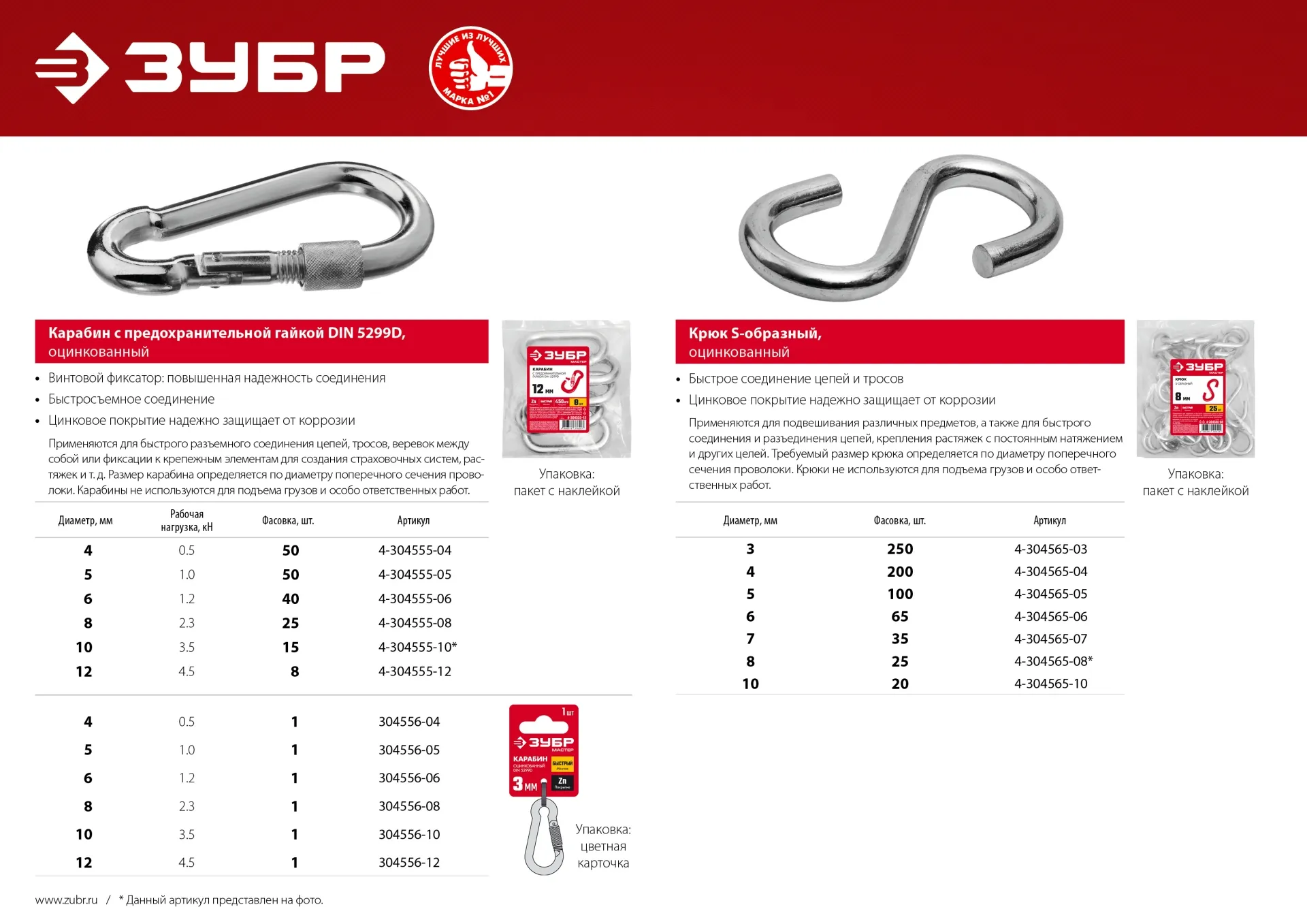 Для быстрого разъемного соединения цепей, тросов, веревок между собой или фиксации к крепежным элементам для создания страховочных систем, растяжек и т.д.. Размер карабина определяется по диаметру поперечного сечения проволоки. Карабины не используются для подъема грузов и особо ответственных работ.