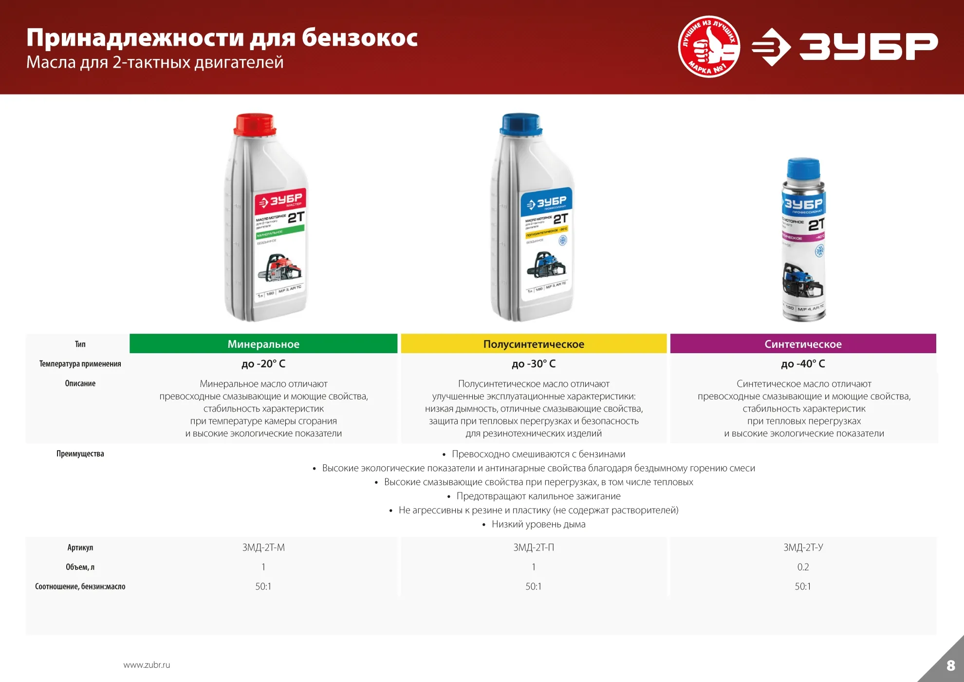 Масло ЗУБР отличают улучшенные эксплуатационные характеристики: низкая дымность, отличные смазывающие свойства, защита при тепловых перегрузках и безопасность для резинотехнических изделий. Предназначено для применения в двухтактных бензиновых двигателях бензопил, триммеров, минигенераторов и т.д.
