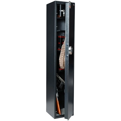 Внешние размеры: 1480x300x300 (ВхШхГ, мм) Внутренние размеры: 1270x294x242 (ВхШхГ, мм) Патронное отделение (трейзер): 201х294х185 (ВхШхГ, мм) Замок: электронный Количество стволов: 4 Количество полок: 4 Вес: 65 кг Объем: 90/11л