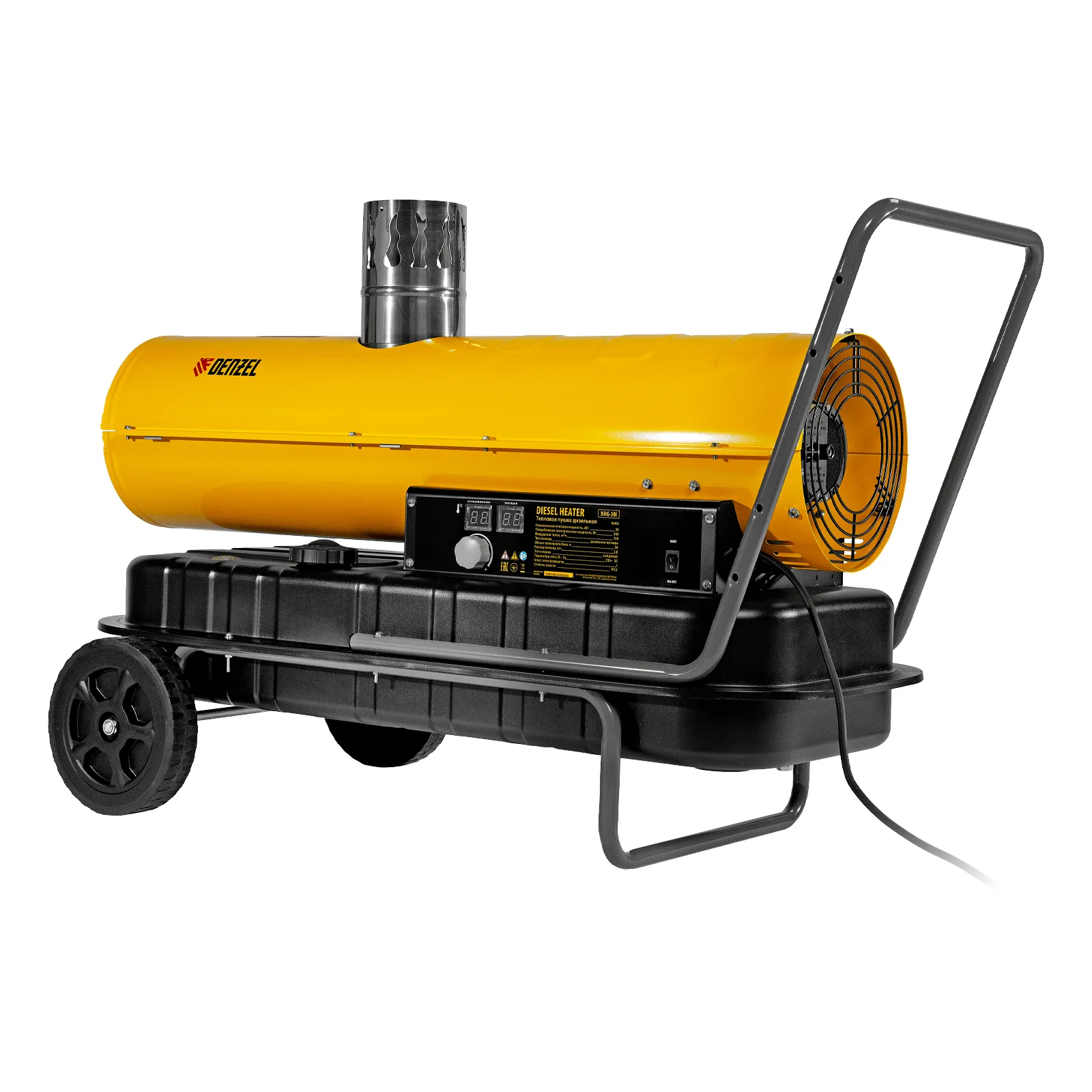 Дизельная тепловая пушка непрямого нагрева DENZEL NHG-30i 96492 с цифровым термостатом обладает тепловой мощностью 30 кВт и генерирует поток теплого воздуха 750 м3/ч. Предназначена для обогрева шатров, палаток, складов, а также технических помещений, ангаров, теплиц и строительных объектов. В работе пушки используется схема непрямого нагрева: при помощи отводного патрубка продукты горения можно полностью вывести за пределы помещения. Такое решение позволяет использовать устройство в присутствии людей. Преимущества Автономная работа — достаточно нажать на кнопку пуска, и автоматика включит подачу топлива и зажигание, по достижении заданной температуры пушка отключится. Контроль нагрева с точностью до 1 °C — цифровой термостат позволяет устанавливать требуемую температуру. Удобный контроль параметров работы — на дисплее можно увидеть значения заданной и текущей температуры воздуха в помещении. Термозащита — при перегреве срабатывает специальный датчик, и тепловая пушка отключается. Безопасная работа — встроенная система защиты прекращает подачу топлива в случае затухания пламени или отключения электропитания. Низкий расход топлива — полного бака хватит на 18 часов работы без дозаправки. Работа без непредвиденных остановок — топливный датчик подскажет, когда следует наполнить бак. Мобильность — благодаря колесам и удобной ручке вы можете легко и быстро перемещать пушку. Гарантия 3 года — высокое качество тепловой пушки подтверждено производителем.