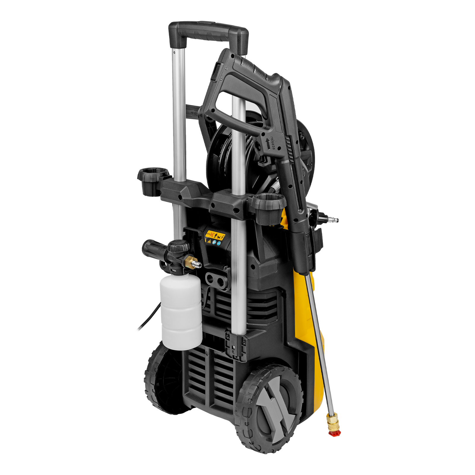 Комплектация | Мойка высокого давления, Барабан для шланга (установлен), Шланг высокого давления (установлен), Пистолет, Удлинитель пистолета, Сменные сопла 3 шт, Пеногенератор с бачком для моющего средства, Входной штуцер с фильтром, Быстросъемный коннектор шланга, кронштейн-держатель пистолета, Кронштей сетевого кабеля, Игла для прочистки сопла, Комплект крепежа, Инструкция с гарантийным талоном |