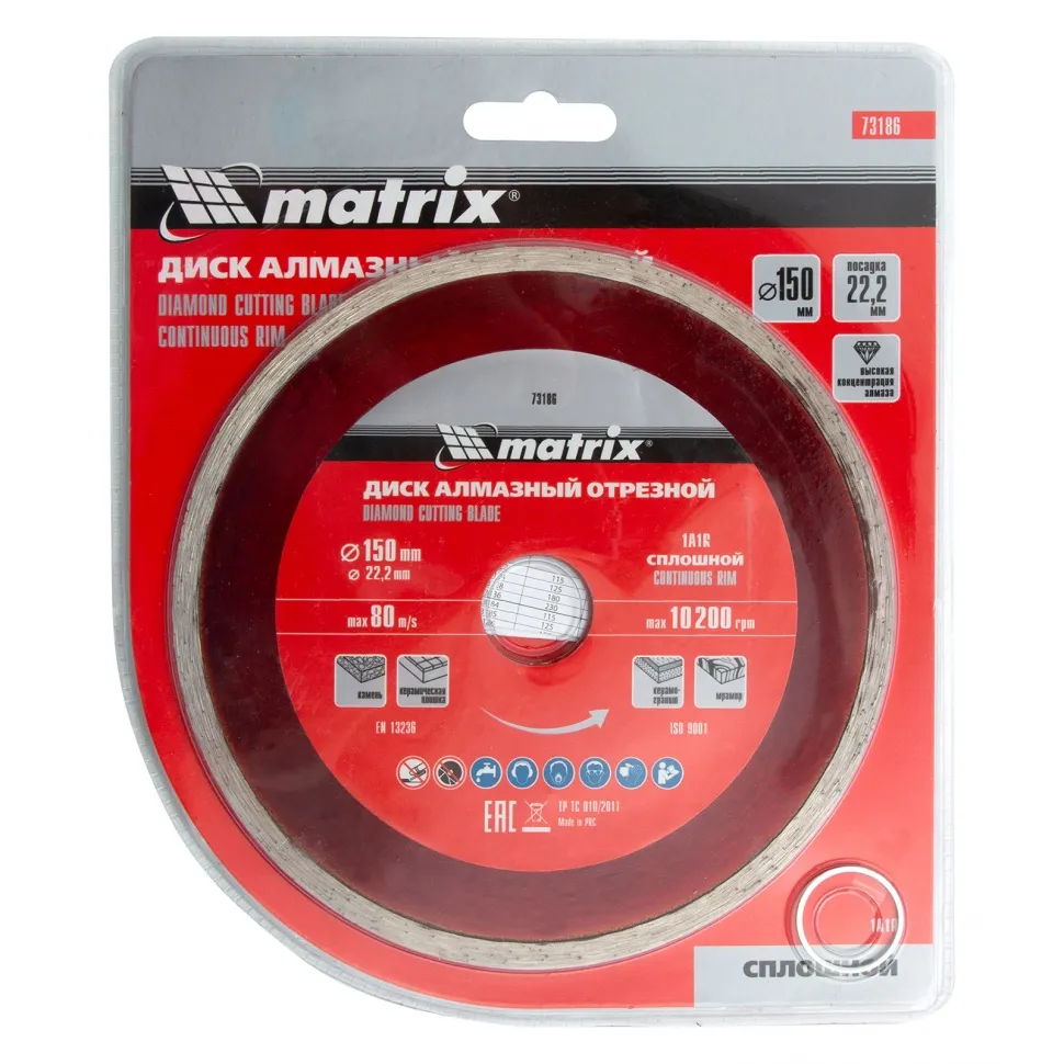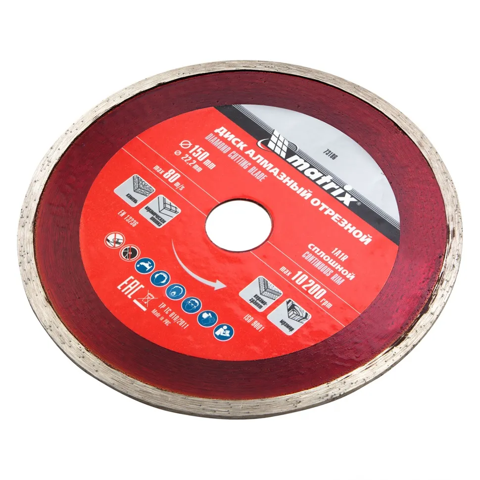 Диск алмазный отрезной сплошной Matrix 73186, 150 х 22,2 мм, предназначен для мокрого реза мрамора, керамической плитки, керамогранита, натурального или искусственного камня. Устанавливается на углошлифовальные машины и плиткорезы с посадочным диаметром 22,2 мм. Благодаря использованию водяного охлаждения улучшается качество реза, а также продлевается срок службы диска.ПреимуществаБлагодаря сплошной кромке и использованию водяного охлаждения срез получается ровным, без сколов и трещин.За счет качественного исполнения методом холодного прессования диск долго сохраняет режущие свойства.Связка из металлических компонентов надежно удерживает алмазы, что обеспечивает высокий рабочий ресурс.Рабочий слой шириной 6 мм с высокой концентрацией алмазов гарантирует хорошую производительность диска.