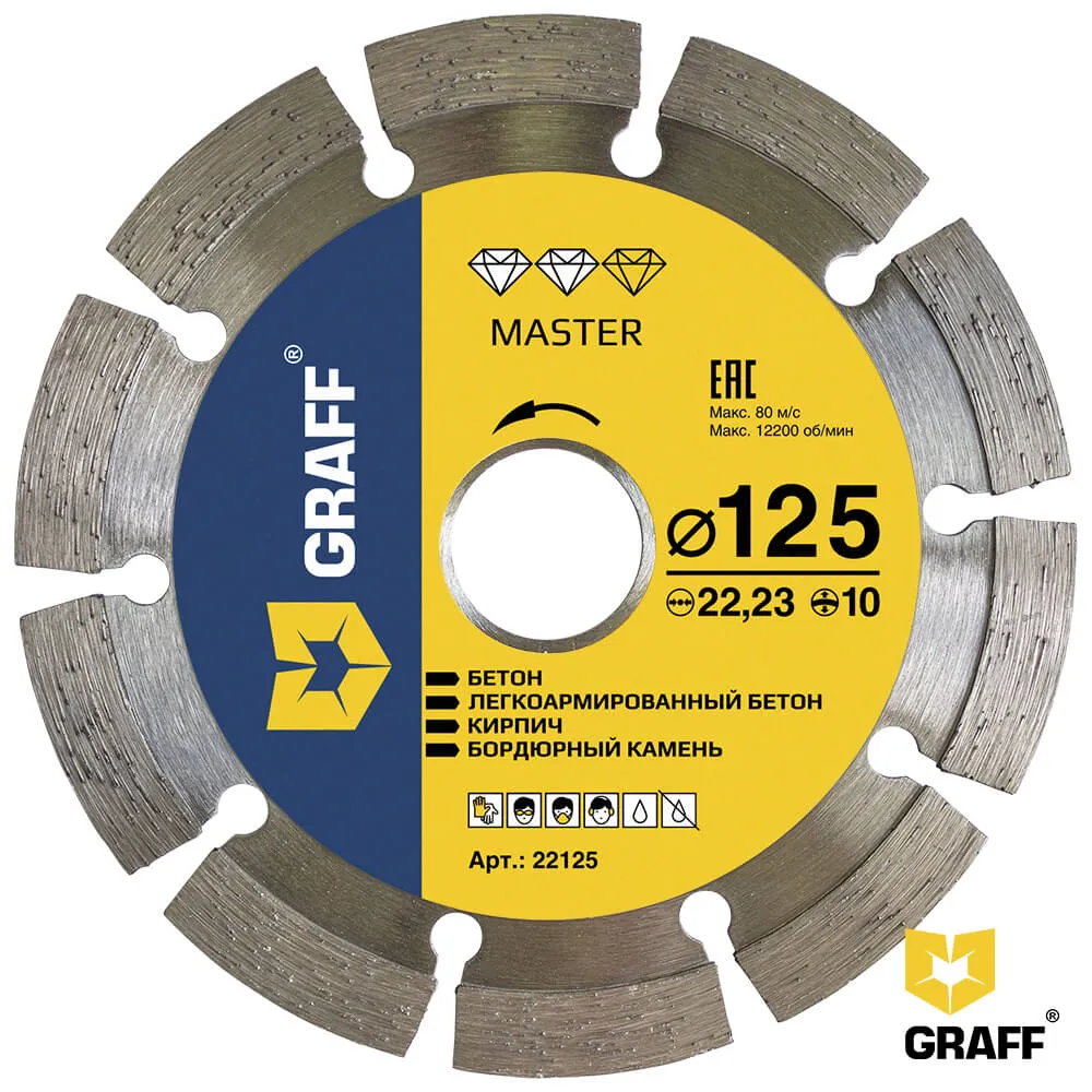 Профессиональный алмазный отрезной диск 125x10x2,2x22,23 мм по бетону и камню GRAFF серия "Master".