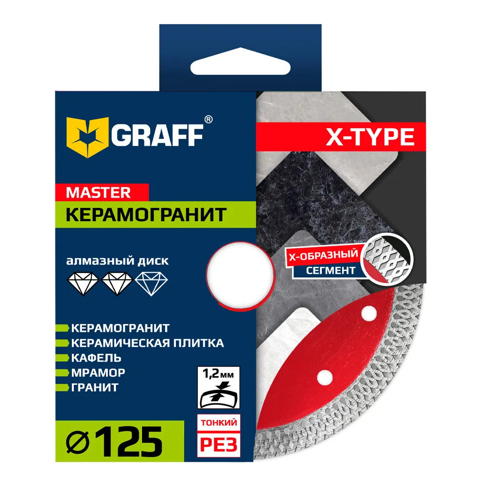Профессиональный алмазный диск 125х10х1,2х22,23 мм X-type GRAFF серии Master предназначен для резки керамогранита, керамической плитки, природного камня, гранита и мрамора.
